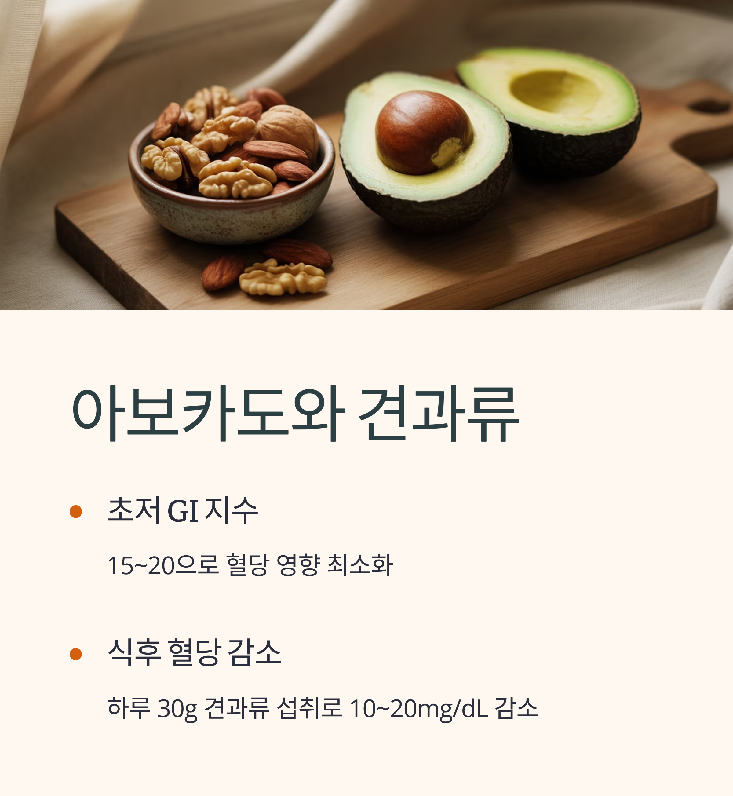 아보카도, 아몬드, 호두 등의 견과류는 GI 지수가 15~20으로 낮고 단일불포화지방산과