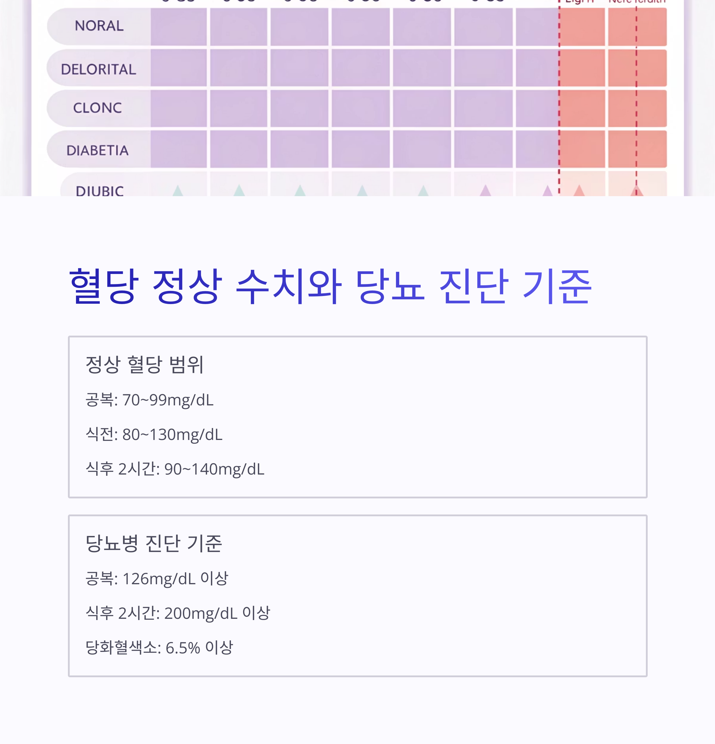 예시: 공복 혈당 103mg/dL, 당화혈색소 6.7% → 당뇨병 진단 기준 초과