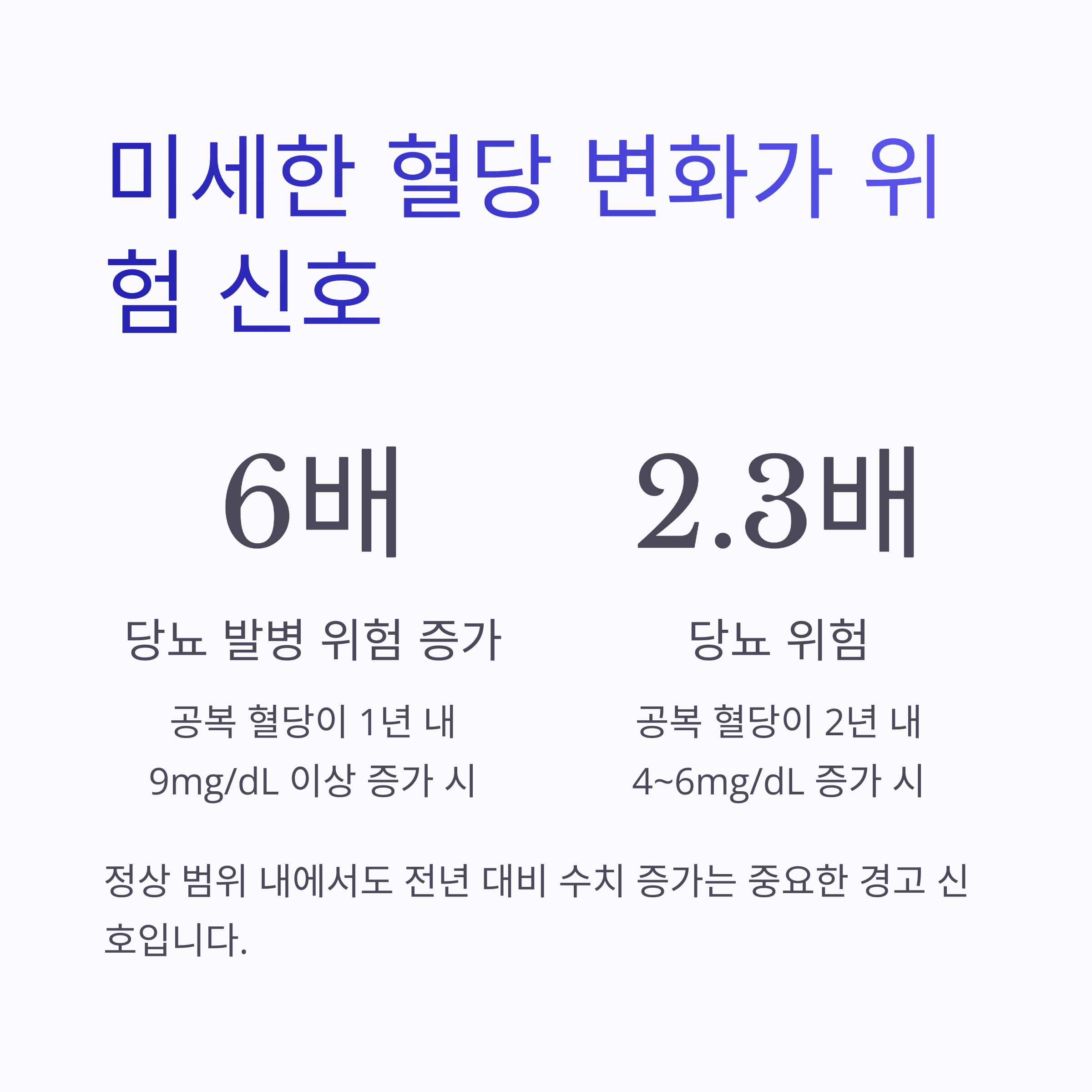 예를 들어 공복 혈당이 82에서 91로 올랐다면, 이는 당뇨병 발병 위험을 6배나 높일 수 있다는 연구 결과가 있습니다. 아래 표는 공복 혈당 변화폭에 따른 당뇨병 위험 증가율을 보여줍니다.