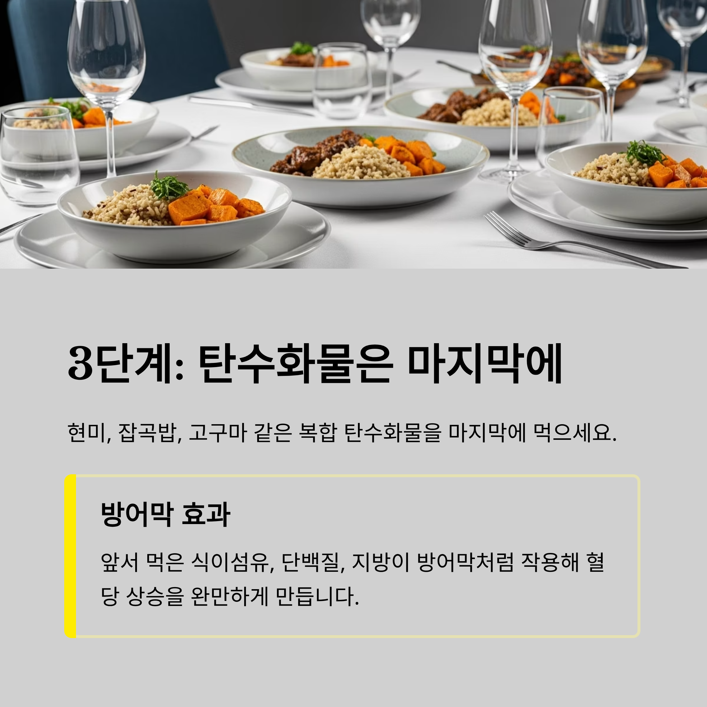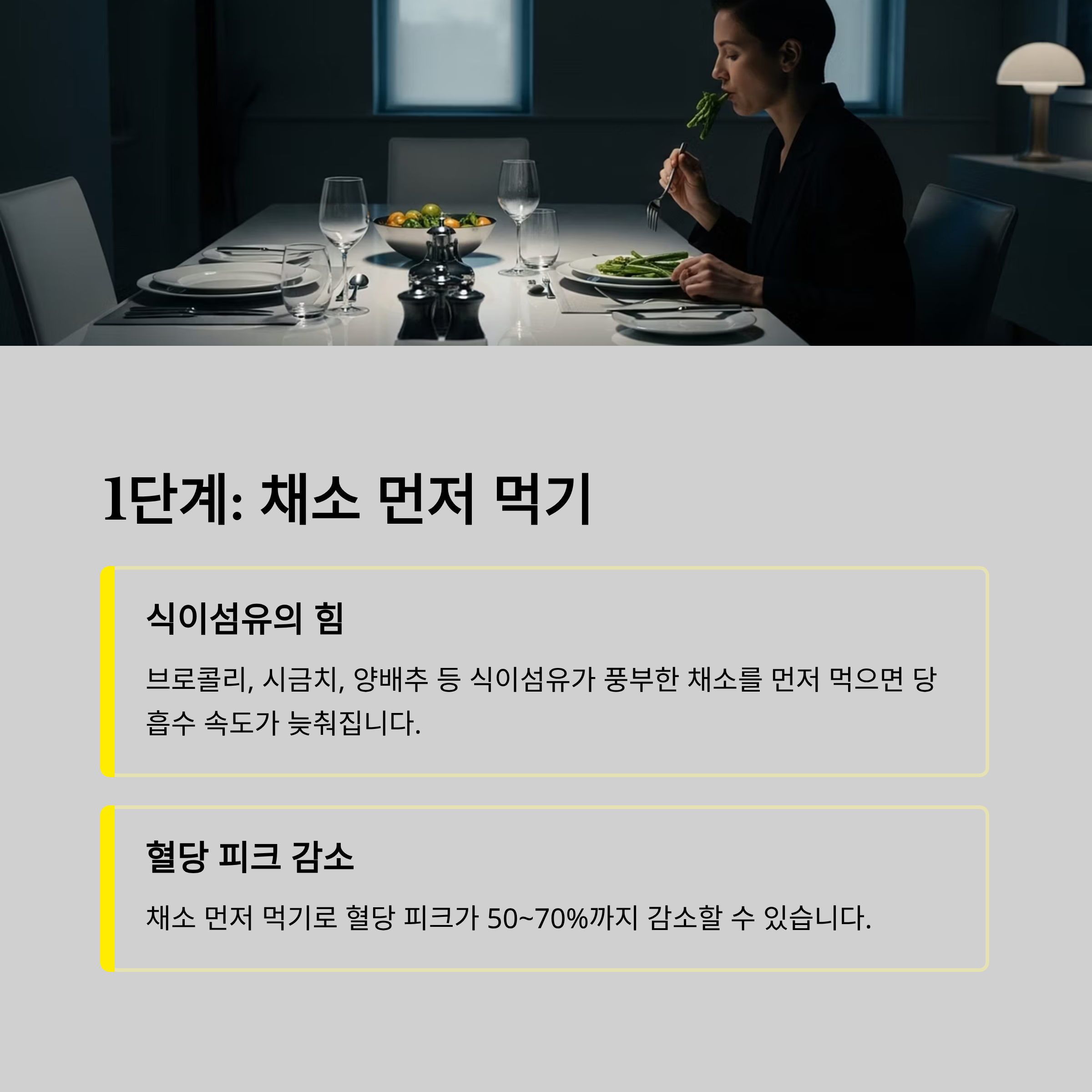 | 채소 → 단백질·지방 → 탄수화물 | 혈당 상승 완만, 포만감 지속 |