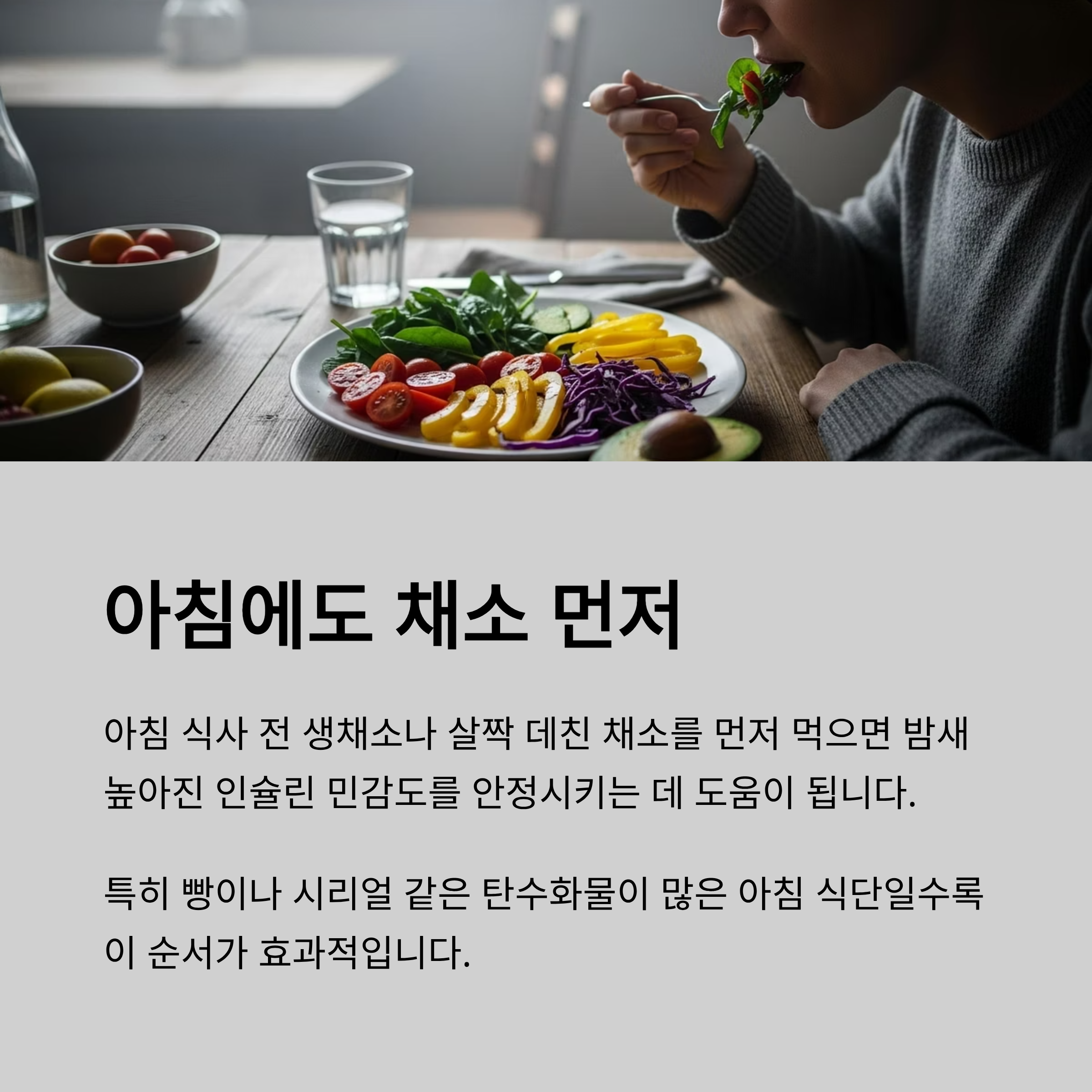 | 채소 → 단백질·지방 → 탄수화물 | 혈당 상승 완만, 포만감 지속 |