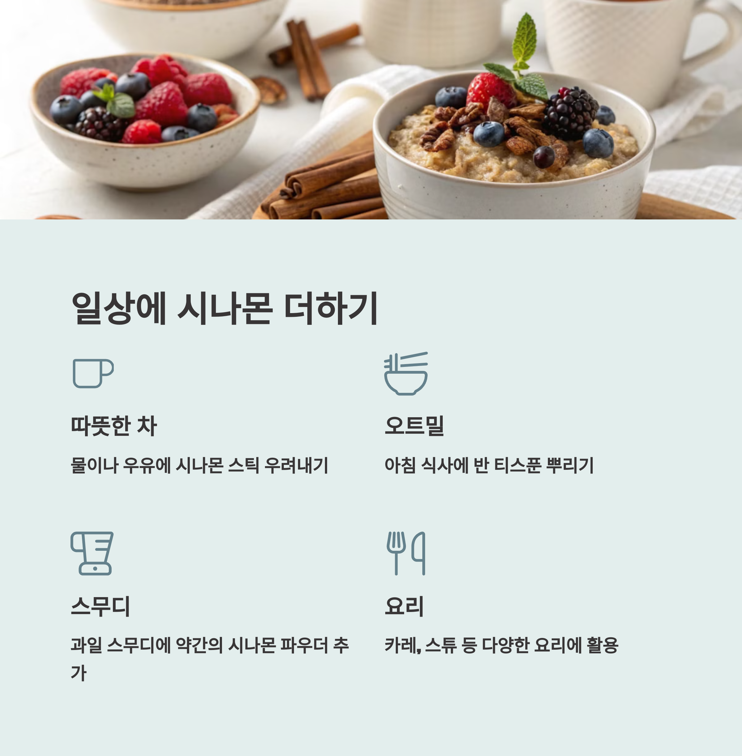| LDL 감소, HDL 증가, 심혈관 건강 | 오트밀, 스무디, 차 등에 활용 | 카시아 시나몬 과다 섭취 주의 |