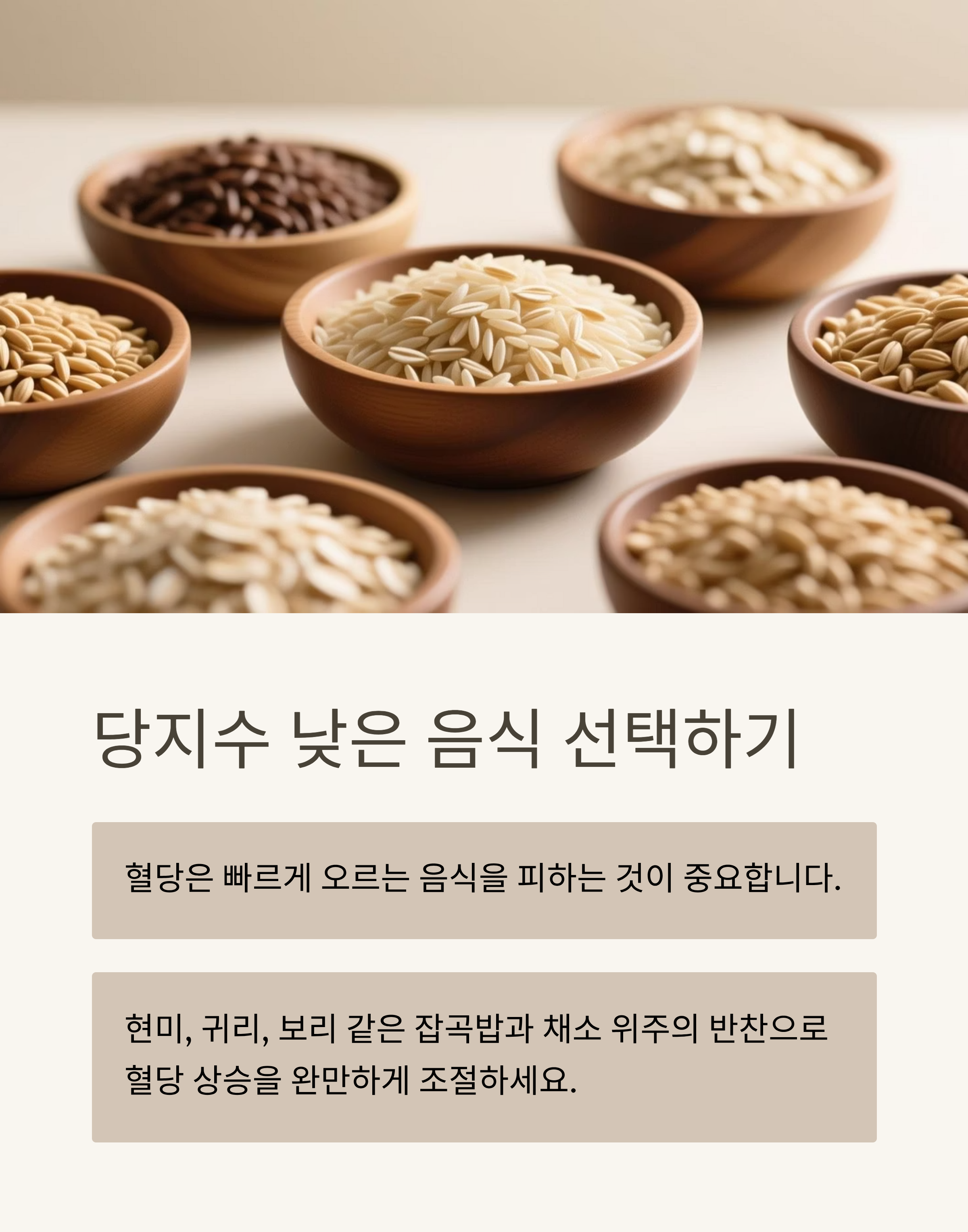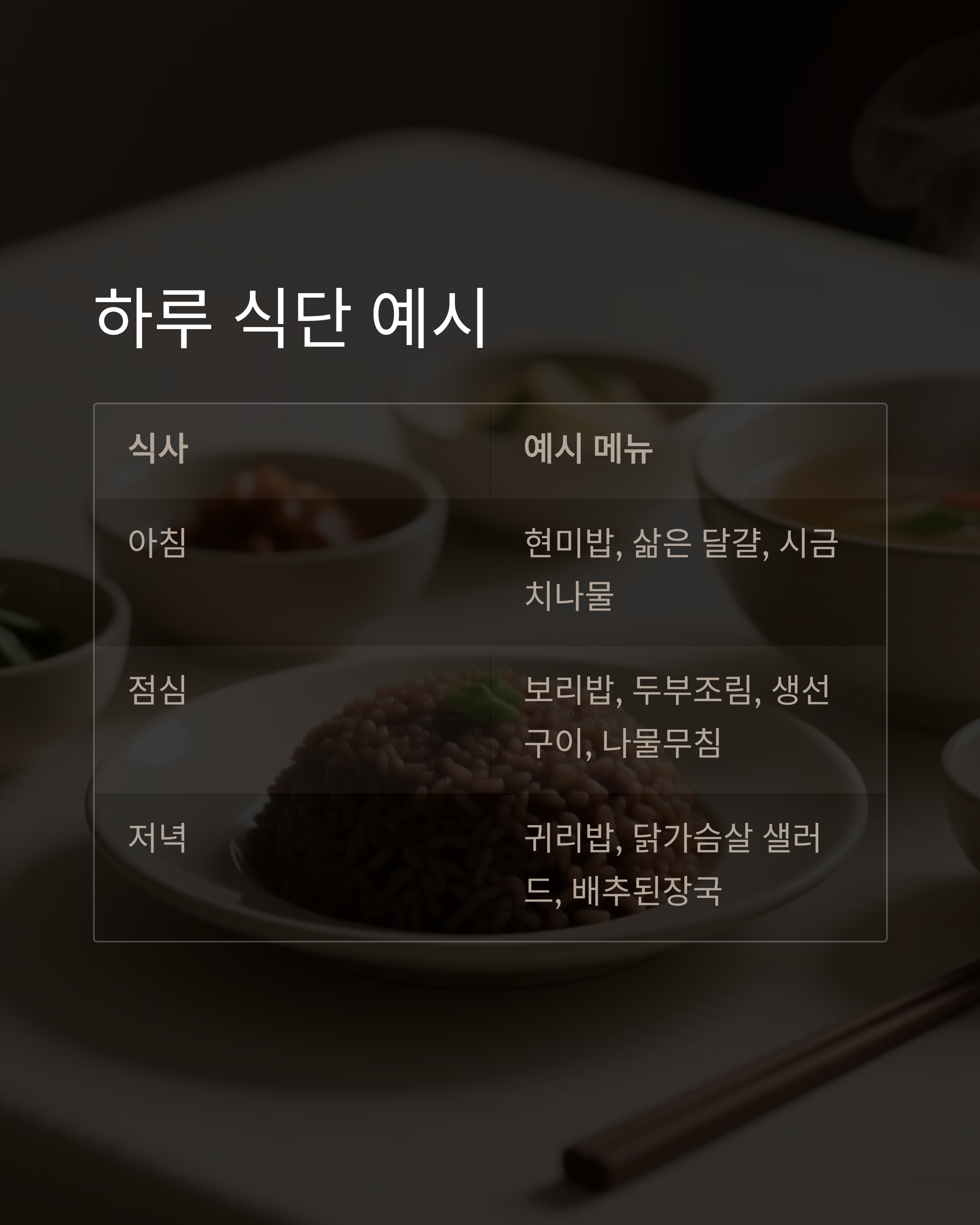 혈당은 빠르게 오르는 음식을 피하는 것이 중요합니다. 현미, 귀리, 보리 같은 잡곡밥과 채소 위주의 반찬을 선택하면 혈당 상승을 완만하게 조절할 수 있습니다.