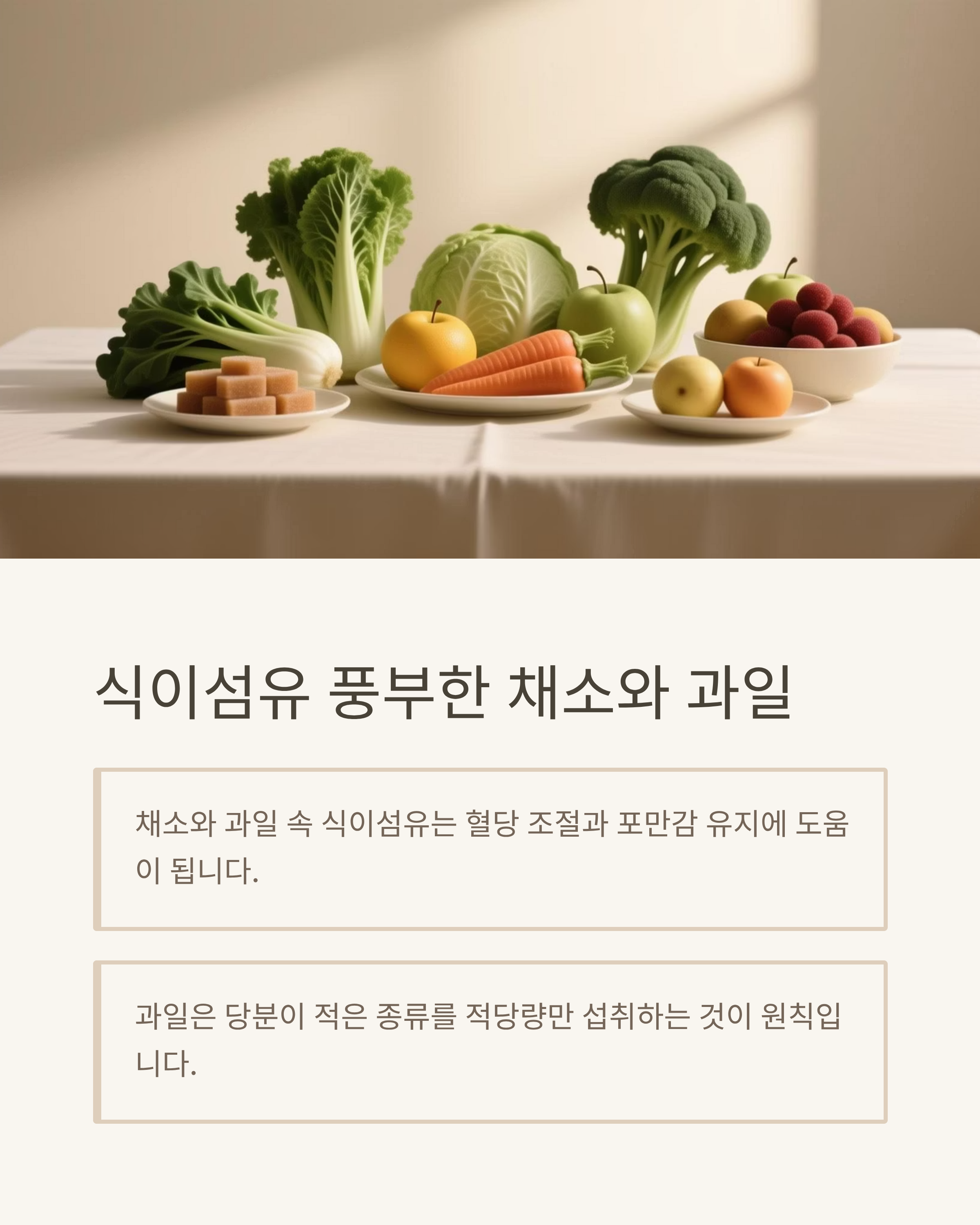 채소와 과일 속 식이섬유는 혈당 조절뿐 아니라 포만감을 유지해 체중 관리에도 도움이 됩니다. 단, 과일은 당분이 적은 종류를 적당량만 섭취하는 것이 원칙입니다.