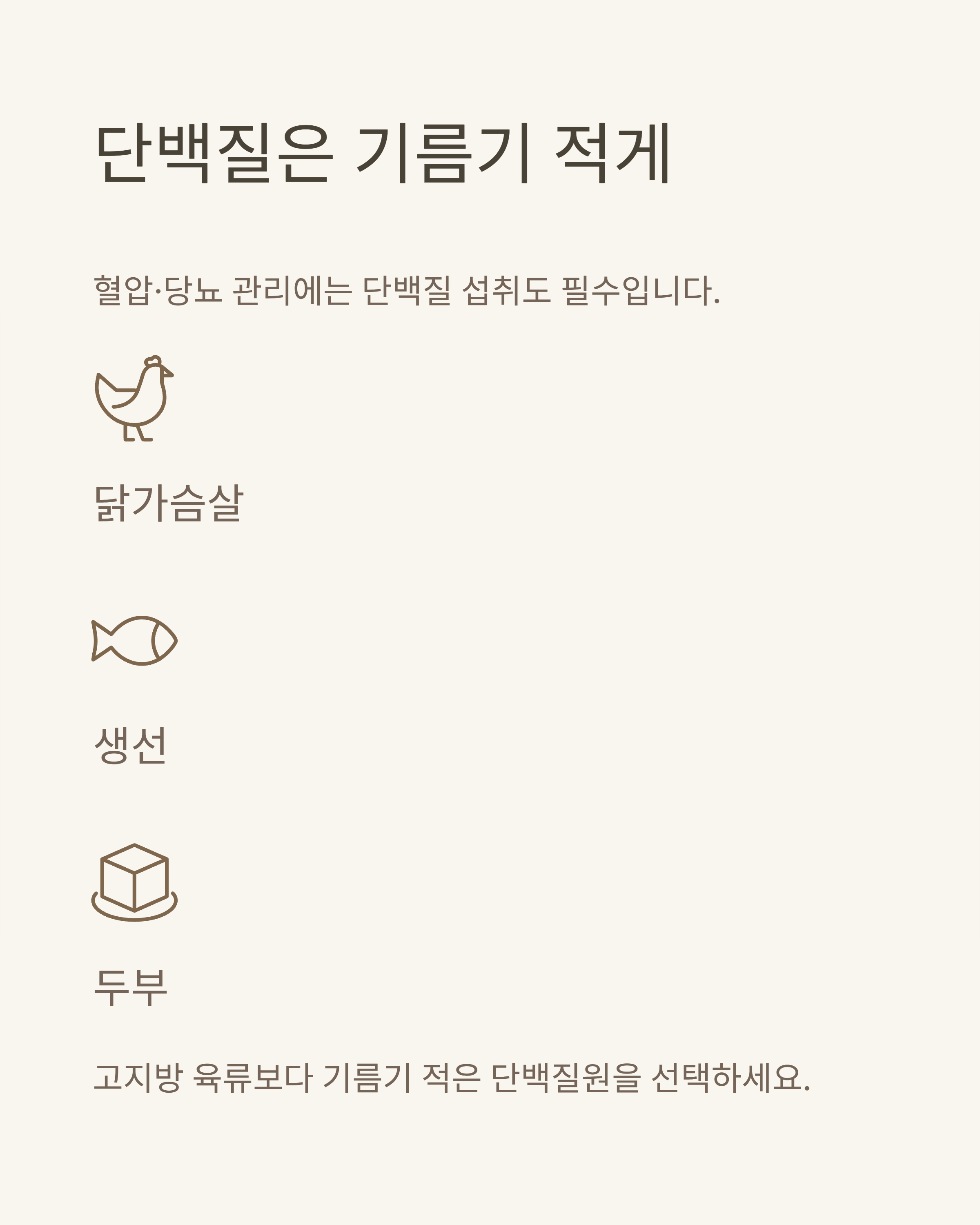 혈압·당뇨 관리에는 단백질 섭취도 필수지만 고지방 육류보다는 닭가슴살, 생선, 두부 같은 기름기 적은 단백질원을 선택하는 것이 좋습니다.