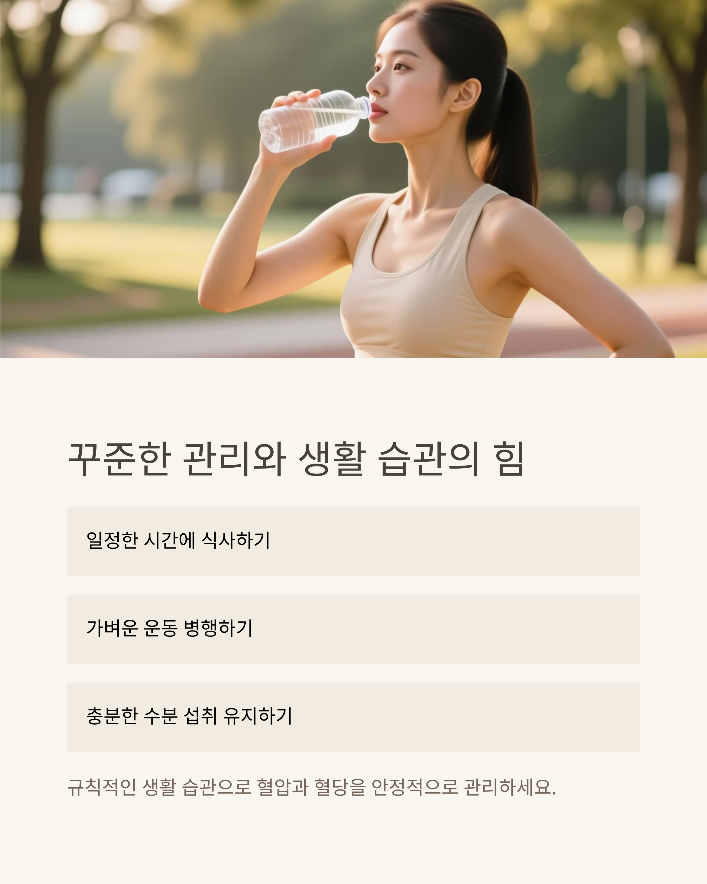 식단만큼 중요한 것이 규칙적인 생활 습관입니다. 일정한 시간에 식사하고, 가벼운 운동을 병행하며, 충분한 수분 섭취를 유지하면 혈압과 혈당 모두 안정적으로 관리할 수 있습니다.