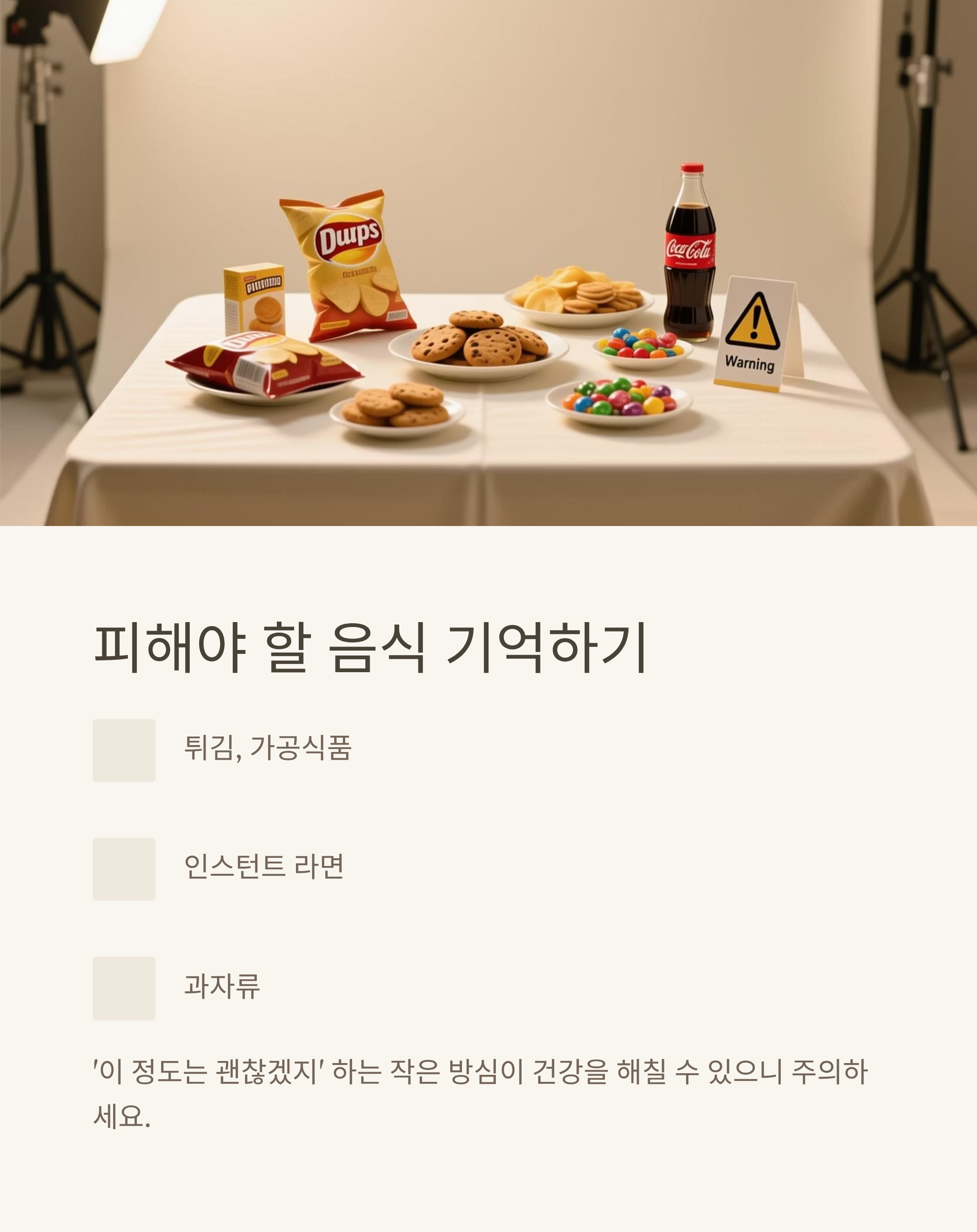튀김, 가공식품, 인스턴트 라면, 과자류 등은 혈압과 혈당 모두에 악영향을 줍니다. '이 정도는 괜찮겠지' 하는 작은 방심이 건강을 해칠 수 있으니 주의하세요.