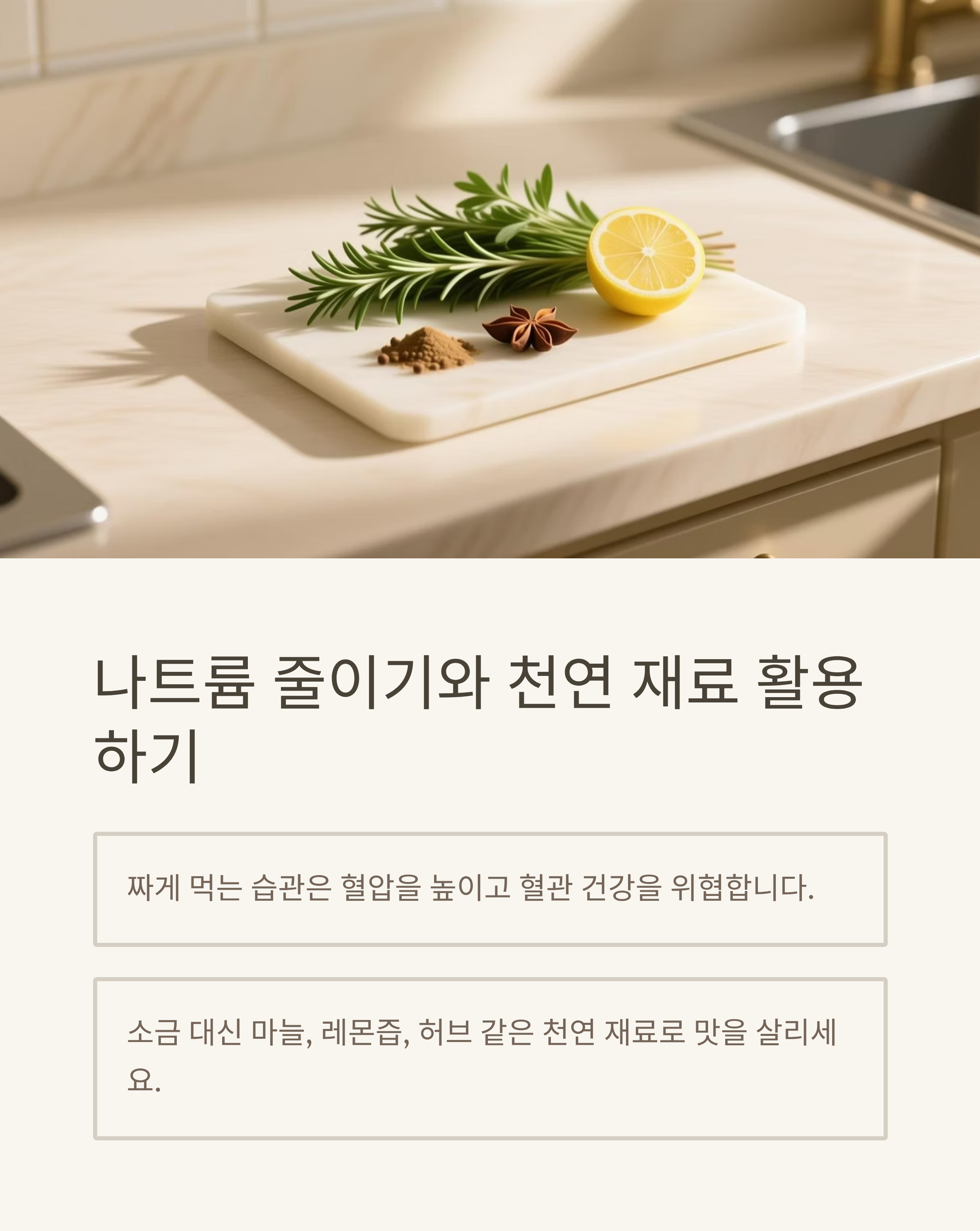 짜게 먹는 습관은 혈압을 높이고 혈관 건강을 위협합니다. 소금을 줄이는 대신 마늘, 레몬즙, 허브 같은 천연 재료를 활용하면 맛은 살리면서도 건강을 지킬 수 있습니다.