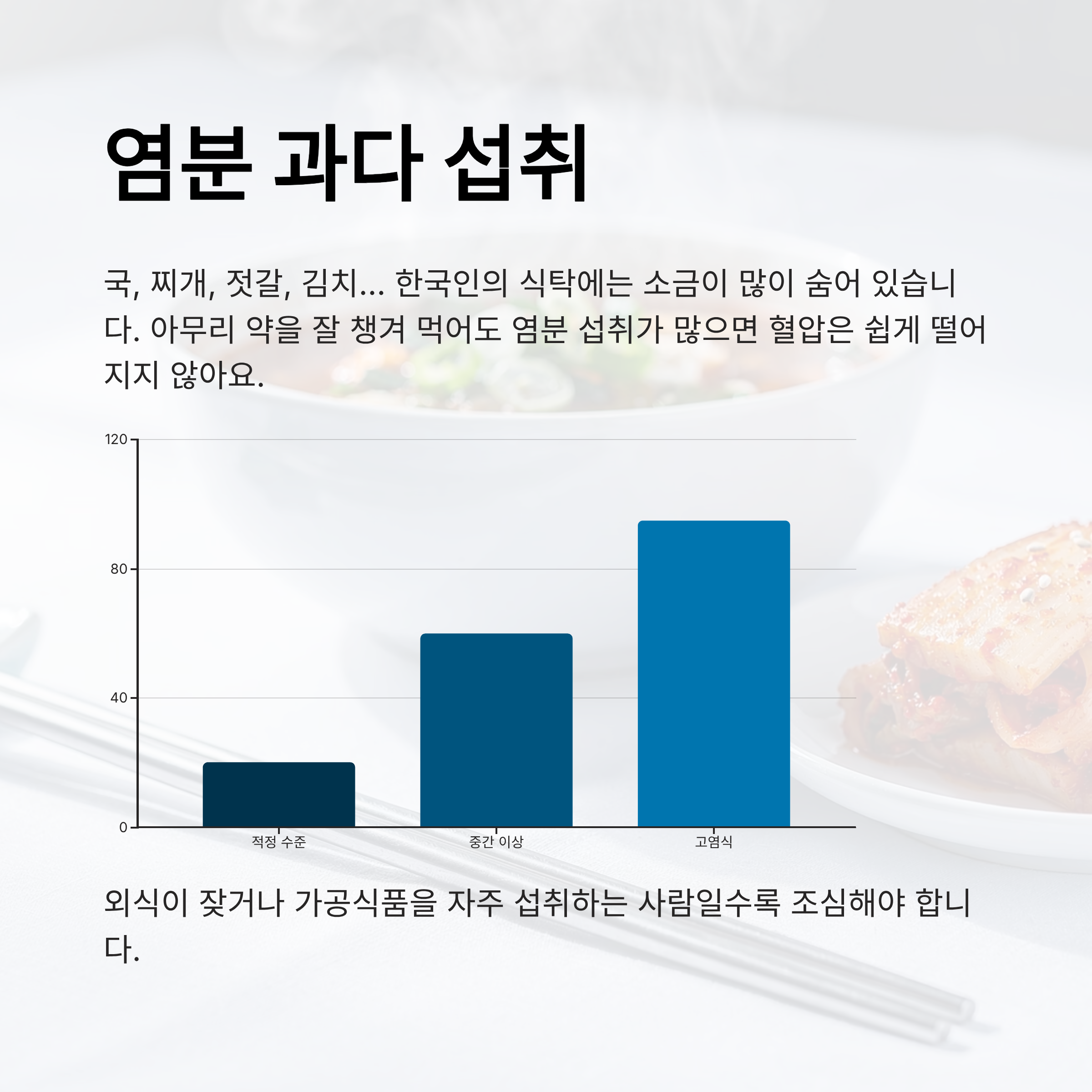 혈압을 높이는 주범 중 하나가 나트륨인데요, 아무리 약을 잘 챙겨 먹어도 염분 섭취가 많으면 혈압은 쉽게 떨어지지 않아요.