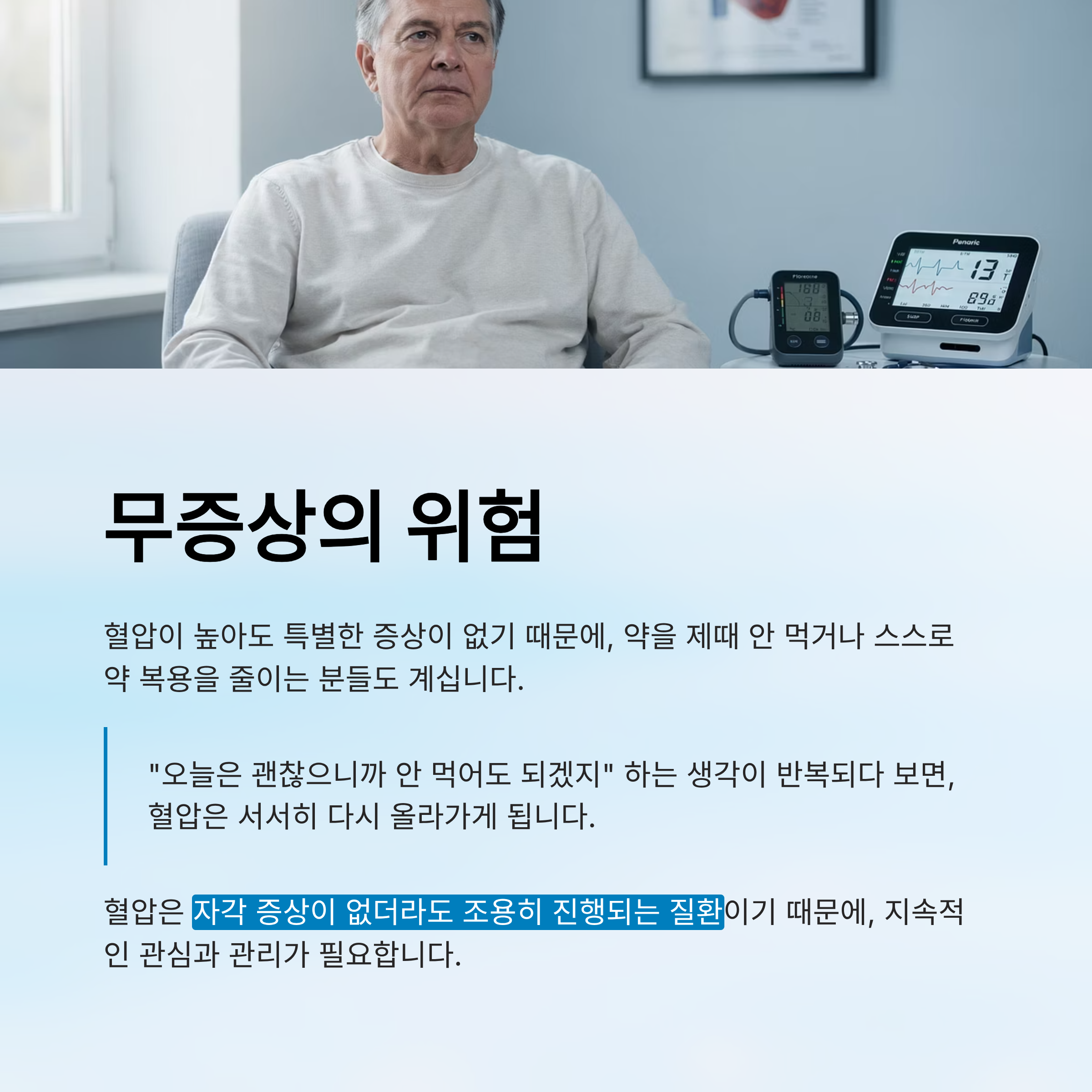 "오늘은 괜찮으니까 안 먹어도 되겠지" 하는 생각이 반복되다 보면, 혈압은 서서히 다시 올라가게 됩니다.