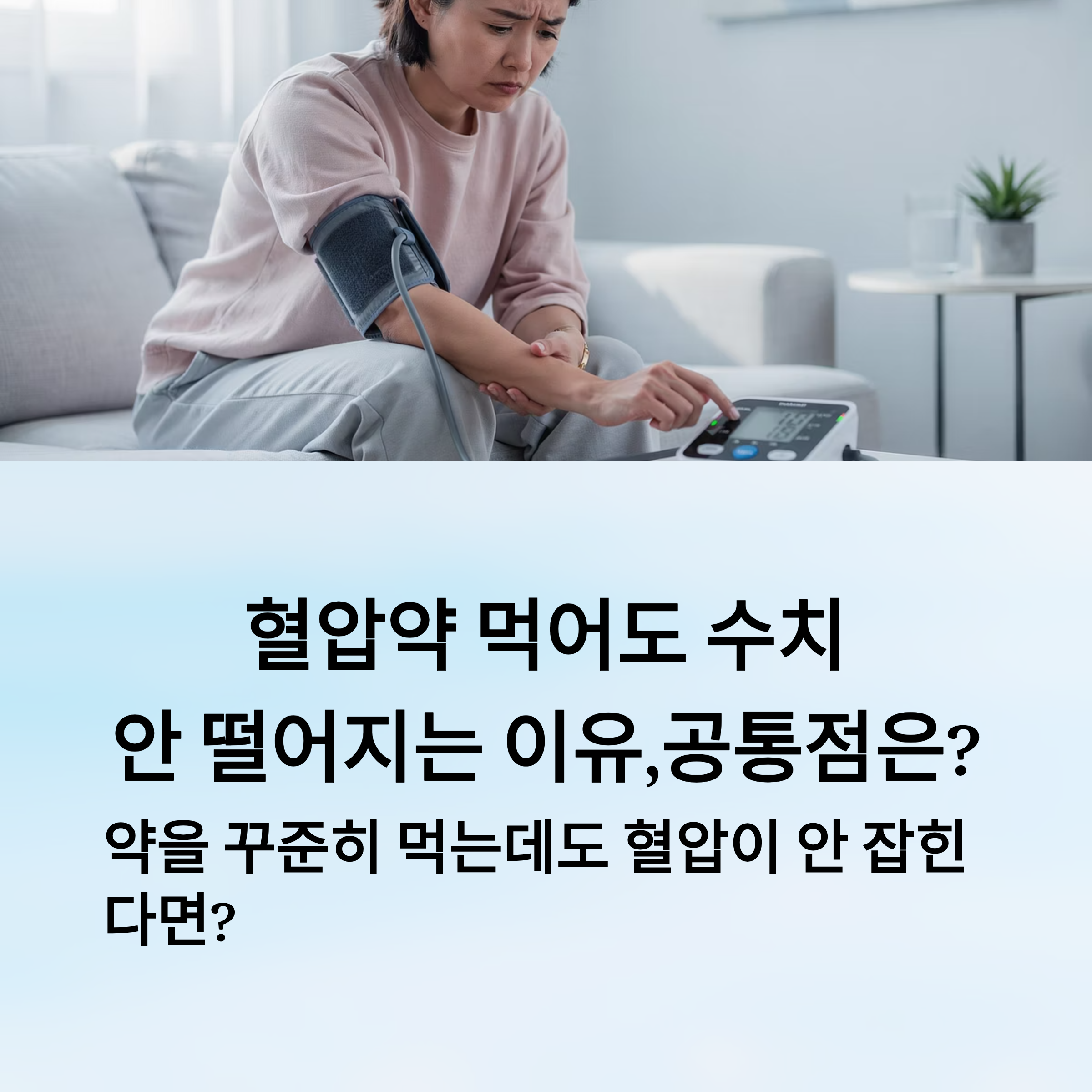 혈압약을 처방받고 성실히 복용 중인데도 혈압 수치가 여전히 높게 나온다면, 단순히 약 효과 부족이 아닐 수 있습니다. 많은 사람들이 모르는 생활 속 원인들이 혈압을 방해하고 있는데요. 이번 글에서는 혈압약을 먹고도 혈압이 잘 떨어지지 않는 사람들에게서 자주 보이는 공통적인 문제점들을 짚어봅니다. 꾸준히 약을 먹고 있는데도 효과가 없다면, 오늘 내용 꼭 확인해 보세요.
