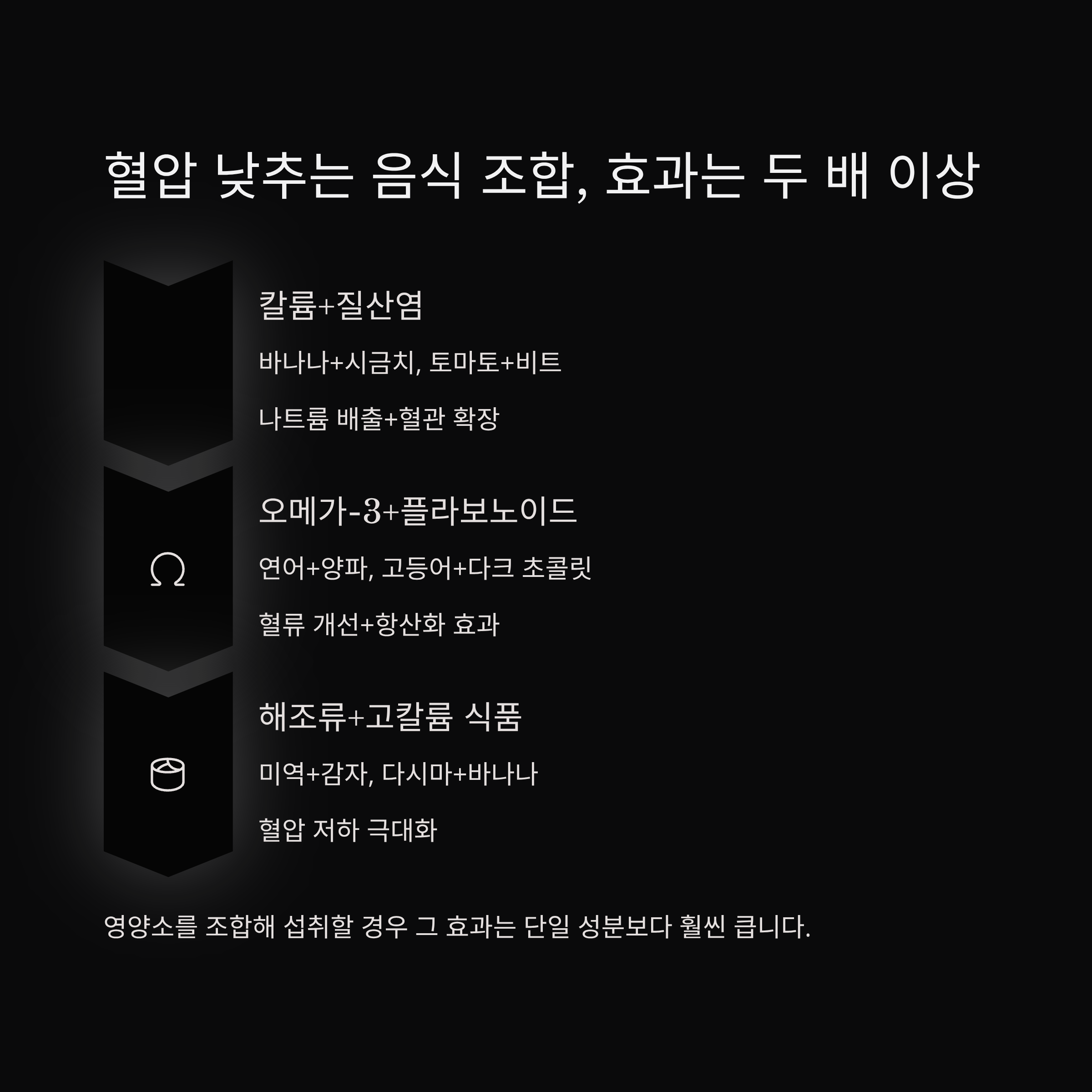 | 해조류+고칼륨 식품 | 미역+감자, 다시마+바나나 | 혈압 저하 극대화 |
