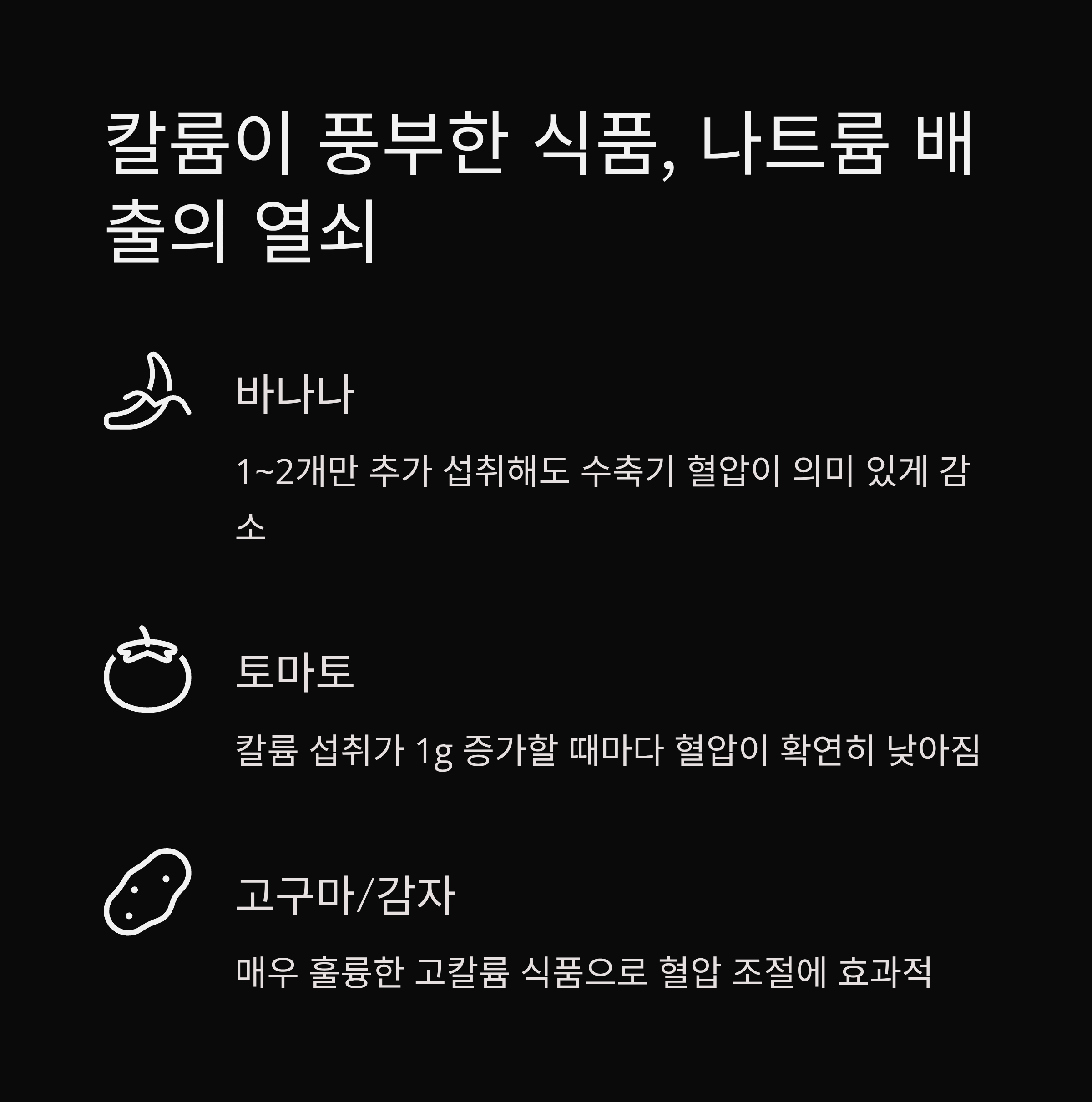 칼륨은 체내 과도한 나트륨을 배출시켜 혈압을 낮추는 데 핵심 역할을 합니다.
