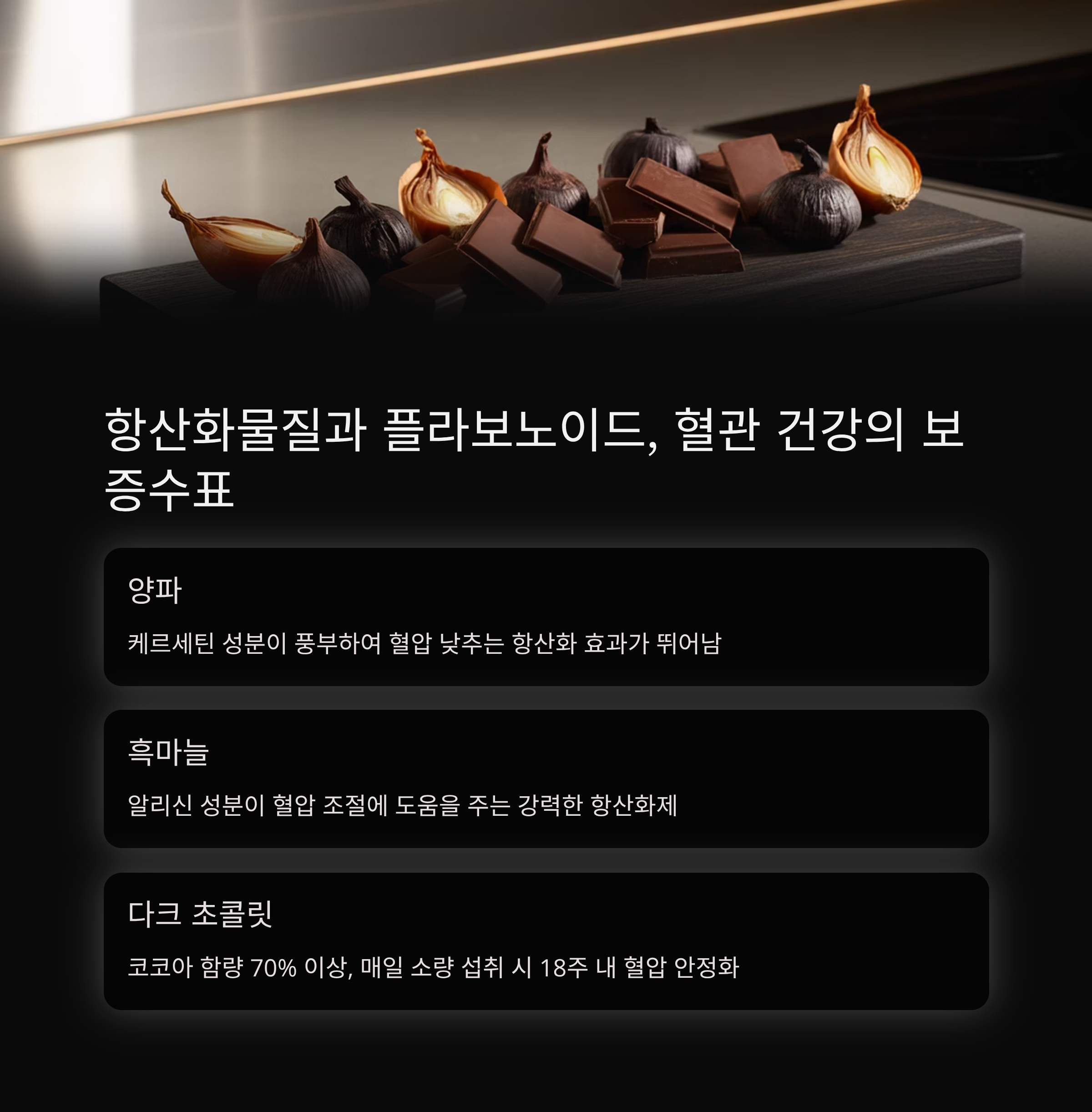 | 오메가-3+플라보노이드 | 연어+양파, 고등어+다크 초콜릿 | 혈류 개선+항산화 효과 |