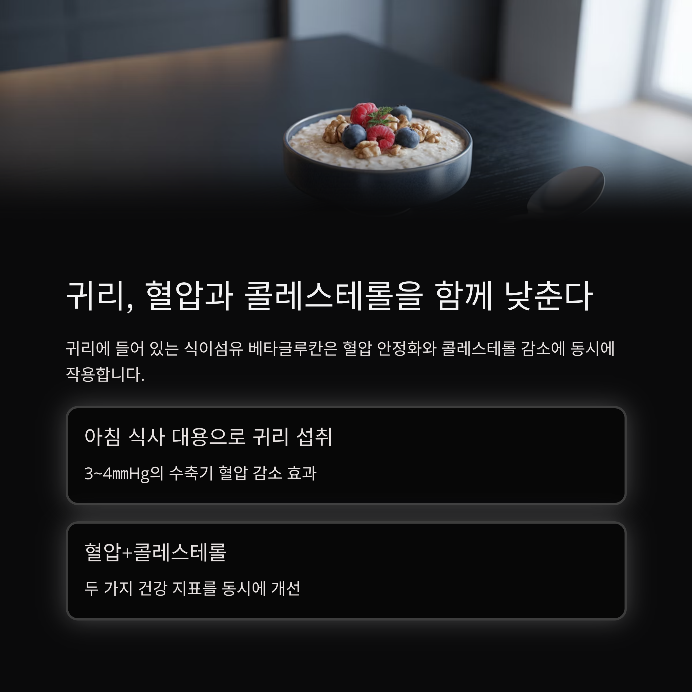 혈압 안정화와 콜레스테롤 감소에 동시에 작용합니다.