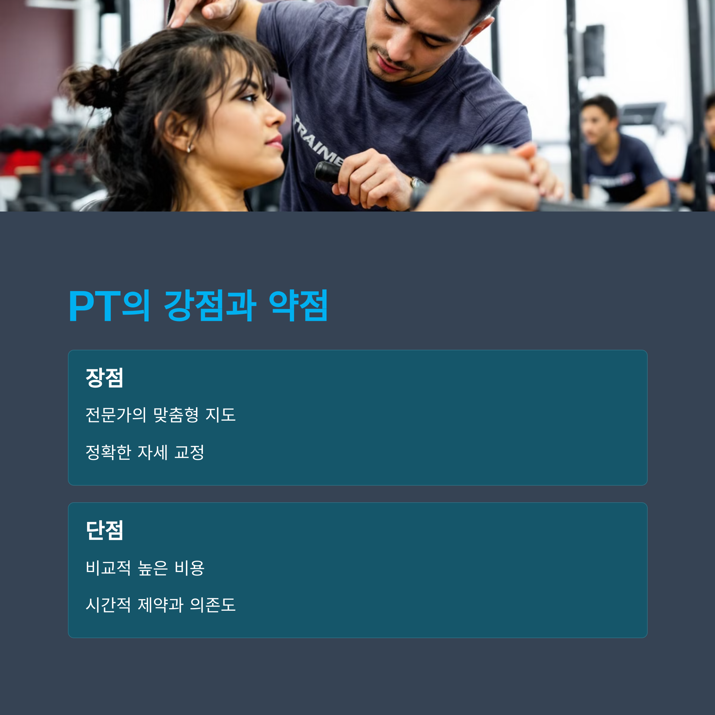 - PT를 선택해야 하는 경우: 운동 경험이 없거나 부상 위험이 높은 경우