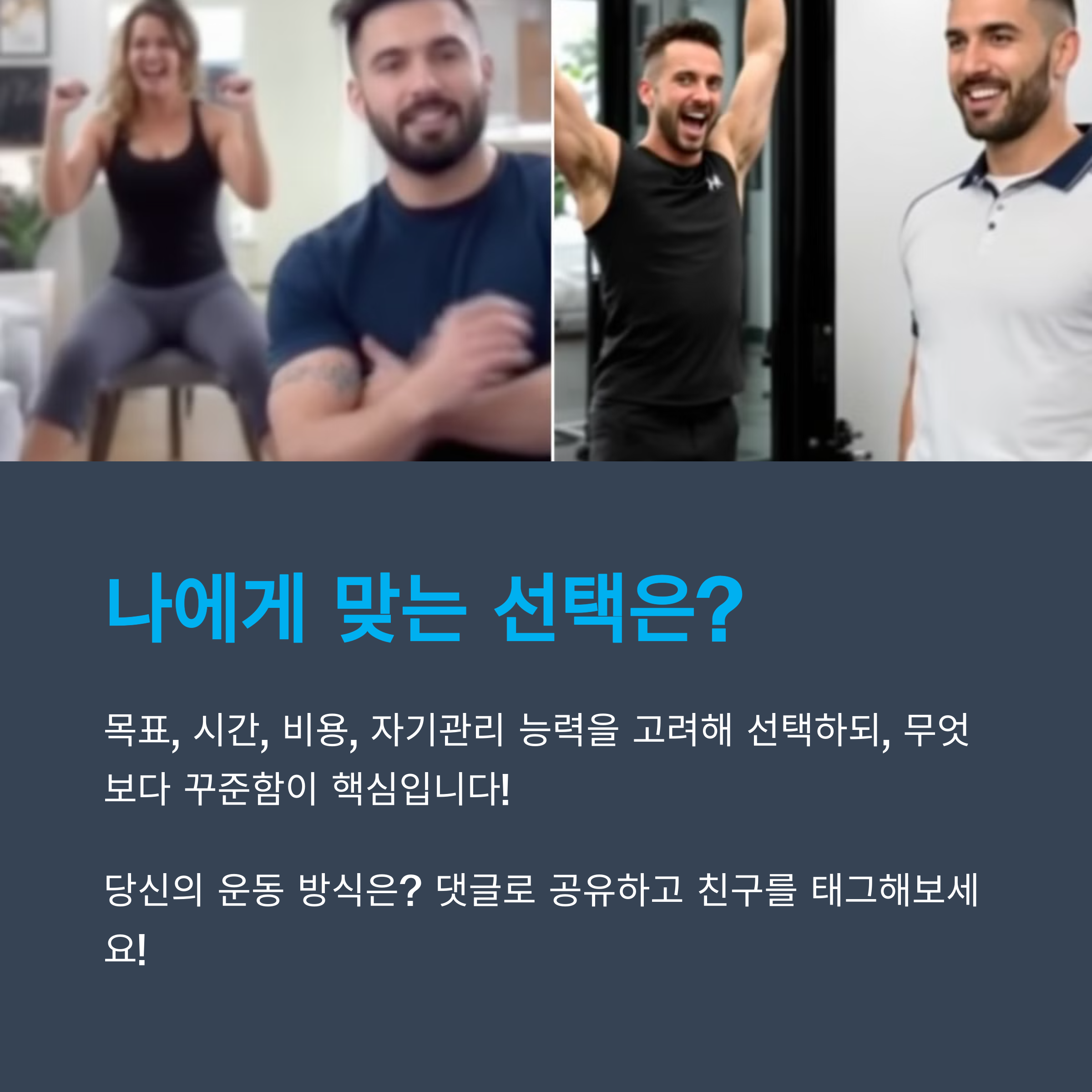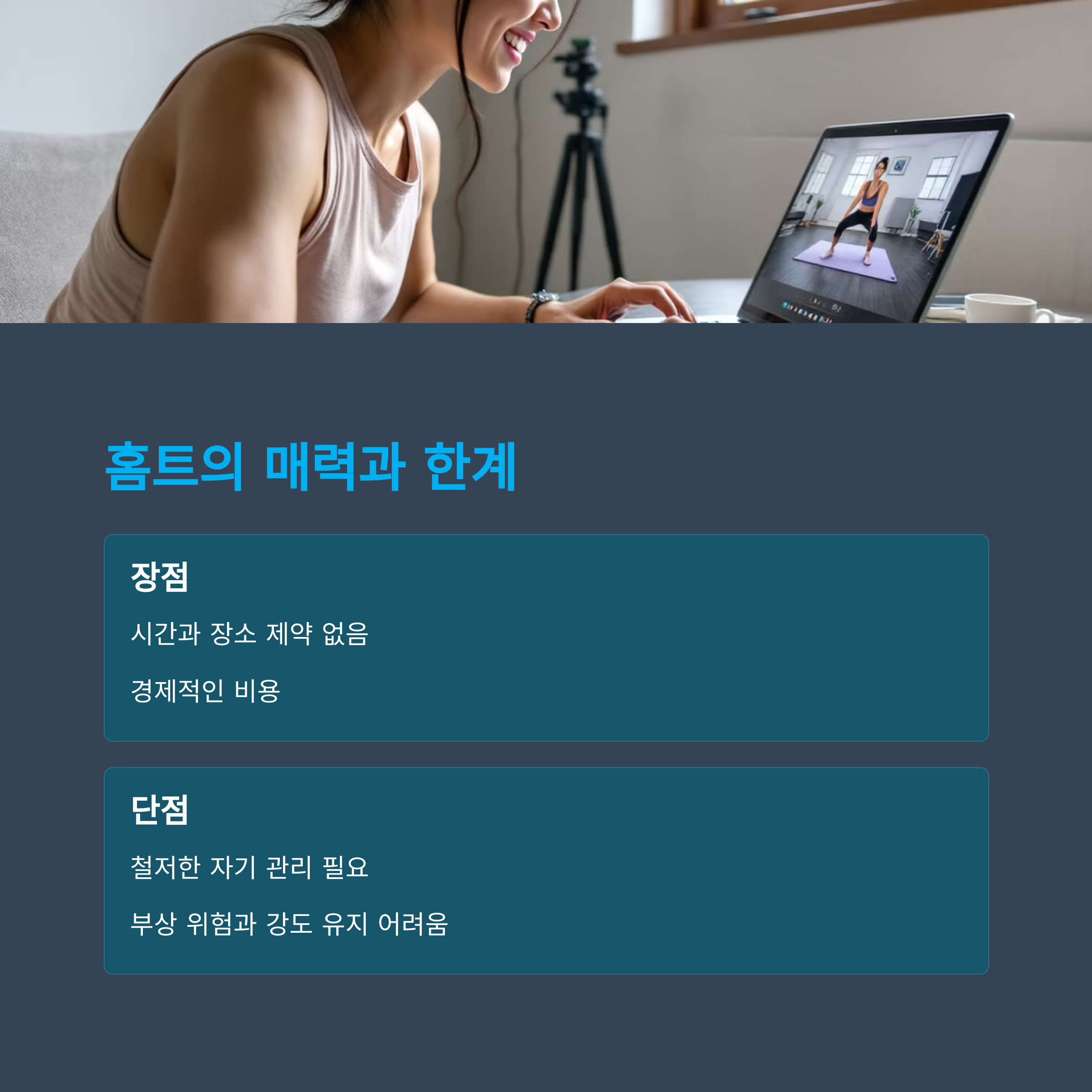- 홈트를 선택해야 하는 경우: 비용을 절감하고 자유롭게 운동하고 싶은 경우