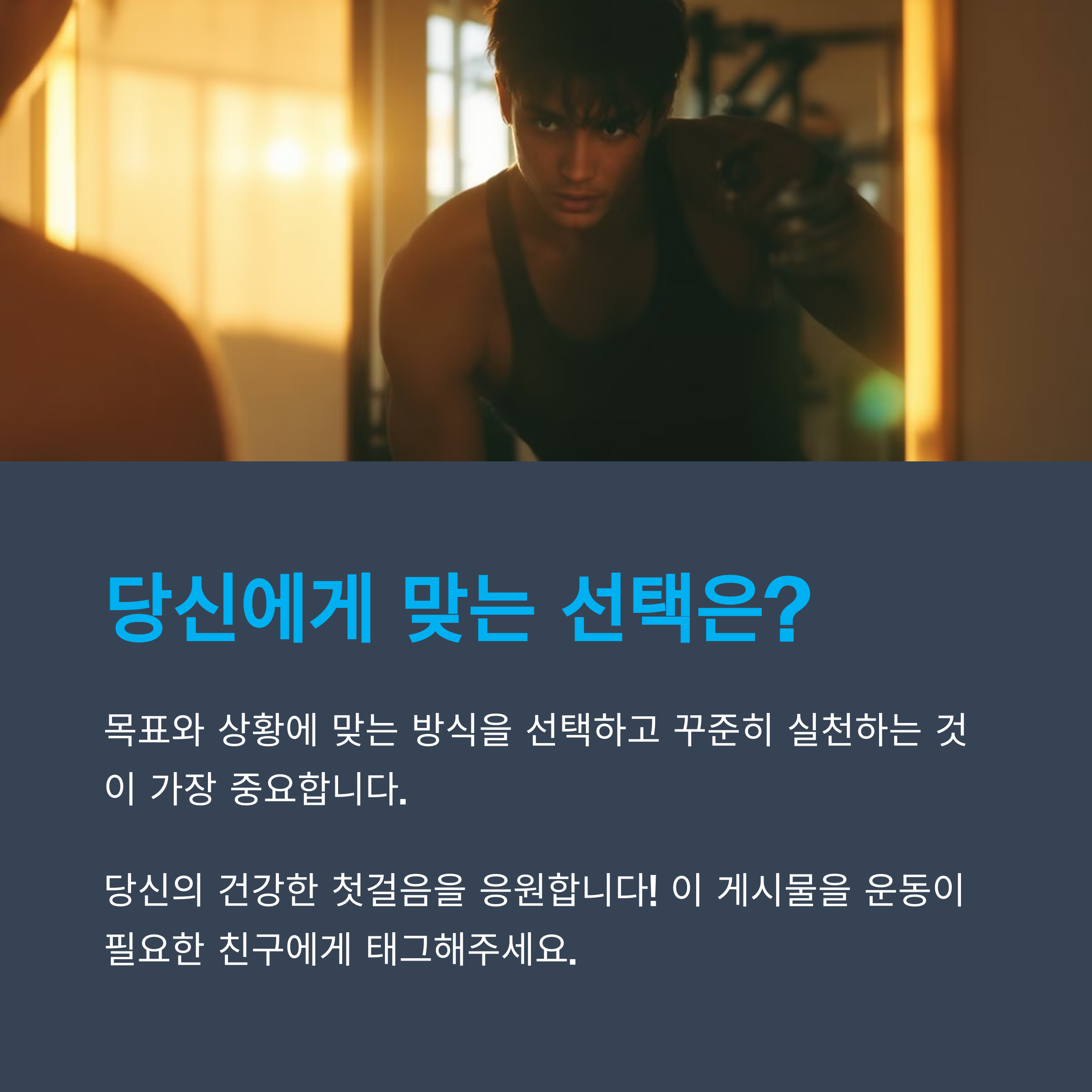 결국, 홈트와 헬스장의 선택은 각자의 운동 목표와 생활 환경에 따라 달라지게 됩니다. 두 가지 모두 효과적인 방법이지만, 중요한 건 '꾸준히' 하는 것이죠. 자신에게 맞는 방법을 선택하고, 그것을 지속적으로 실천하는 것이 가장 큰 성과를 가져다줄 것입니다.