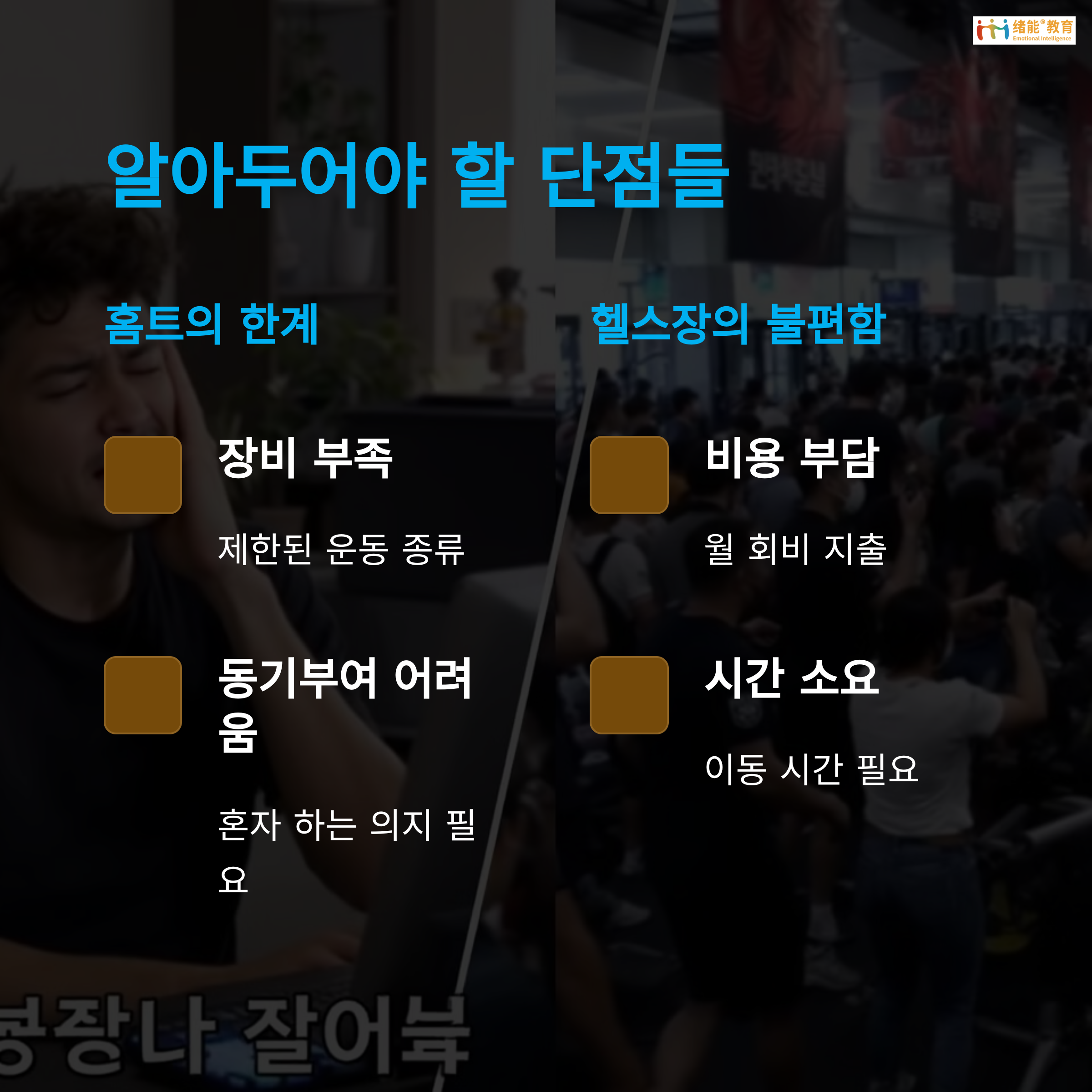 헬스장의 단점은 이동 시간과 비용이 추가로 들 수 있다는 점입니다. 또한, 정해진 운영 시간에 맞춰 가야 해서 자주 갈 수 없을 수도 있죠. 그렇지만 다양한 운동 기구와 시설을 갖춘 점은 큰 장점입니다.