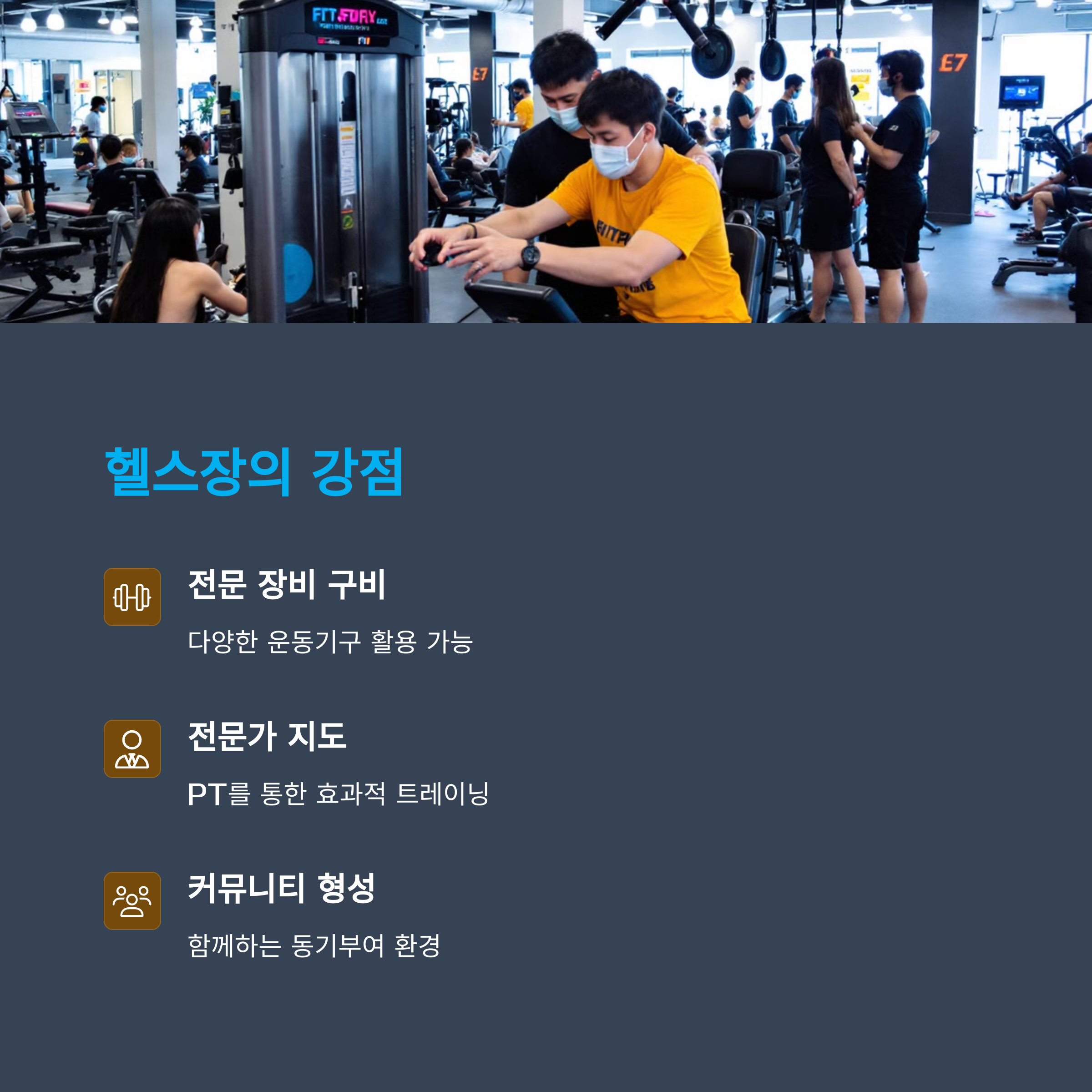 | 전문 트레이너 | 헬스장에서 제공하는 전문가의 도움으로 운동 효율을 극대화할 수 있어요. |