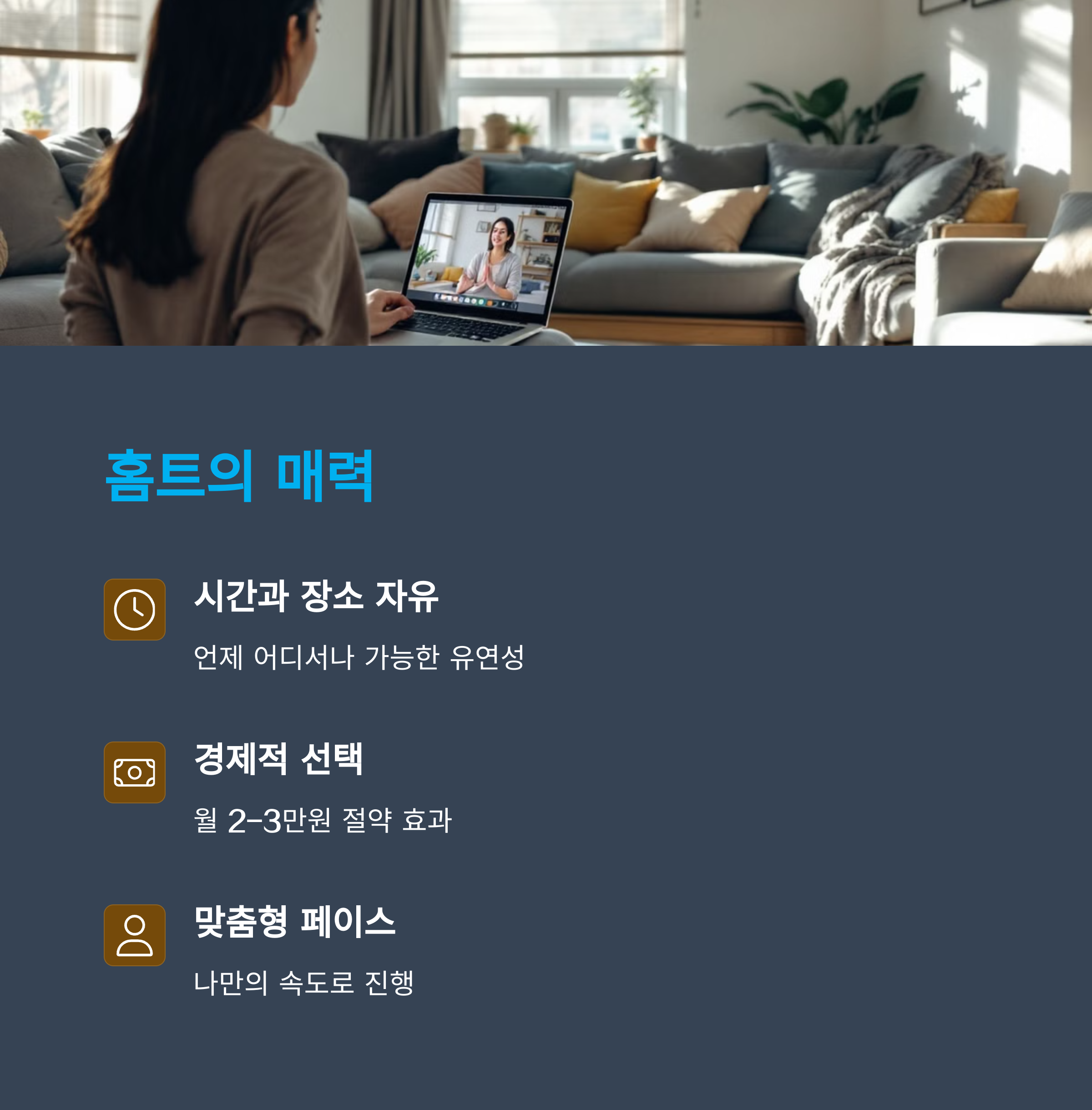 홈트의 가장 큰 장점은 언제 어디서든 자유롭게 운동을 할 수 있다는 점이에요. 시간이 부족한 분들에게는 큰 장점이 될 수 있습니다. 또한, 추가 비용이 거의 들지 않아 경제적입니다.