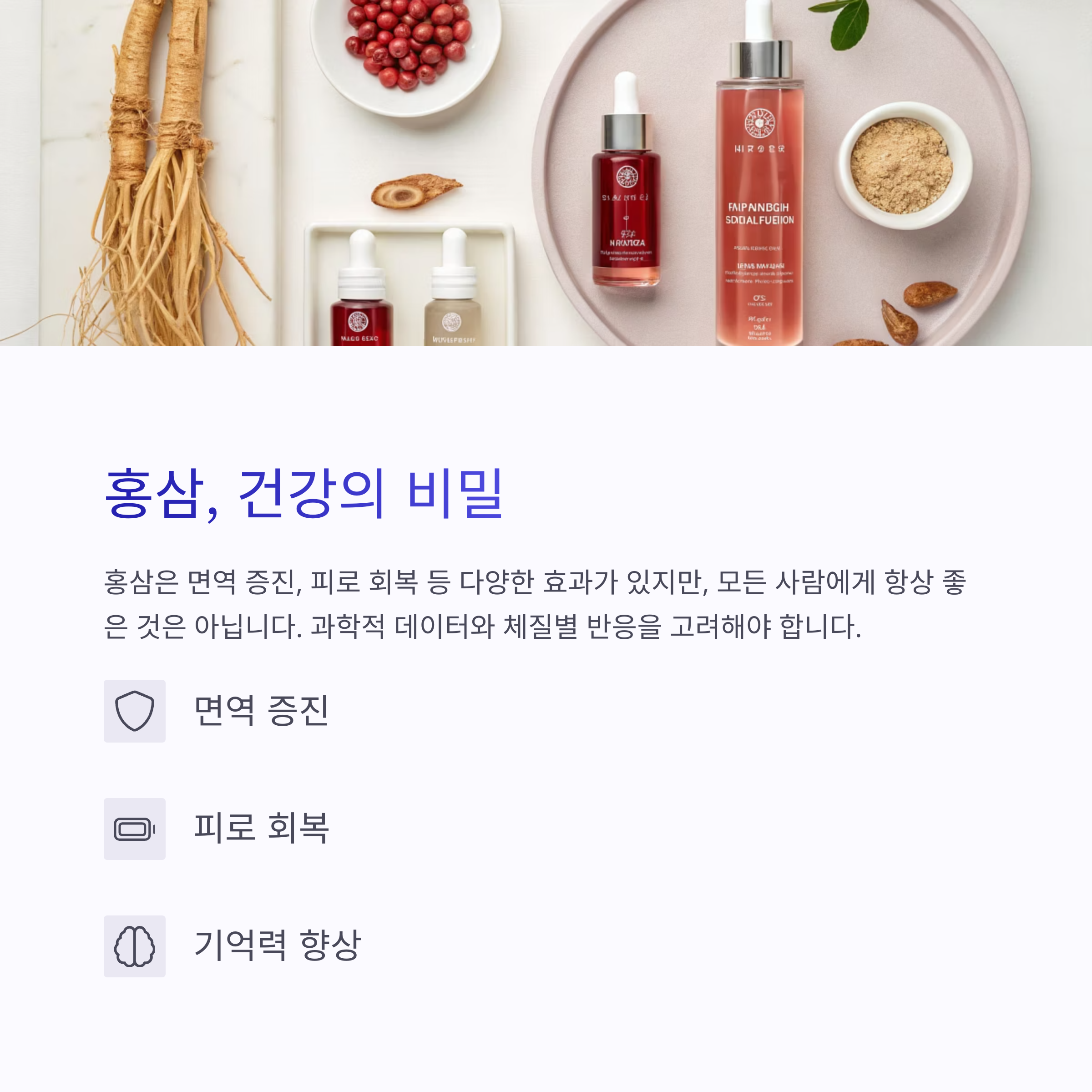 데이터 기반의 접근과 체질 맞춤 사용이 바로 홍삼을 건강하게 섭취하는 첫걸음입니다.