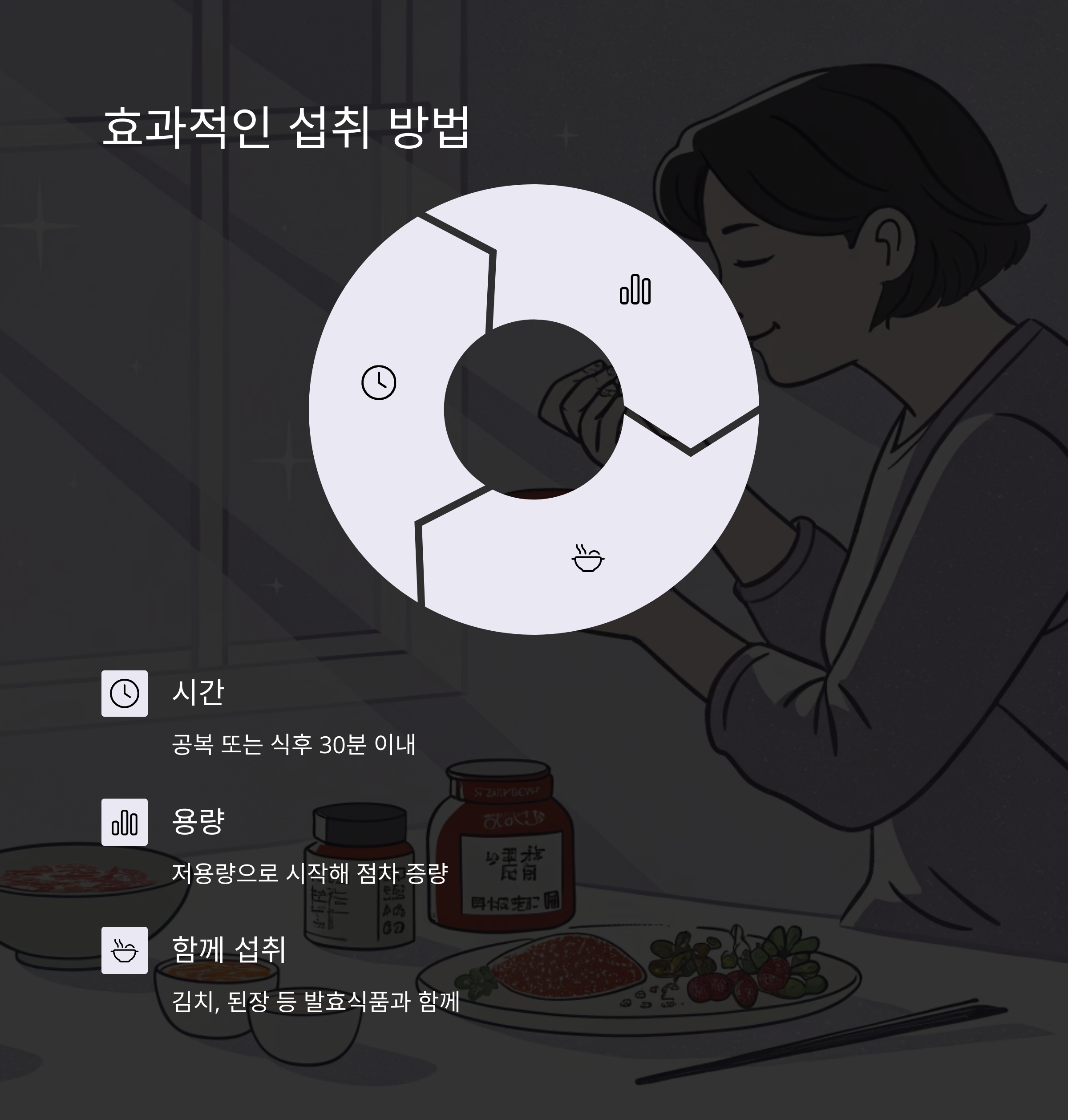 장 건강을 고려해 김치, 된장 등 발효 식품과 함께 복용하면 흡수율 개선에도 좋습니다.