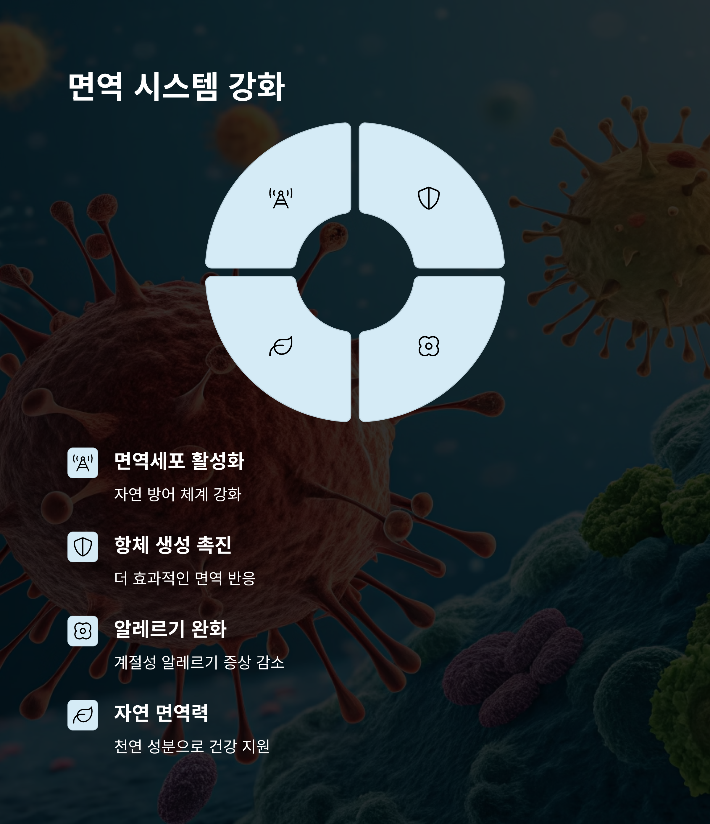 황기는 면역력을 향상시키는 데도 중요한 역할을 합니다. 황기의 폴리사카라이드 성분은 자연살해세포(NK 세포)의 활동을 45% 증가시키며, 백혈구 생성을 촉진합니다. 특히, 7일간 황기를 섭취한 실험에서 CD4+/CD8+ T세포 비율이 22% 상승한 것으로 나타났습니다. 이러한 결과는 면역이 약해지기 쉬운 환절기나 피로 누적 시기에 황기가 유용할 수 있음을 보여줍니다. 계절성 알레르기로 고생하는 분들에게도 황기는 재채기와 콧물 증상 완화에 도움을 줄 수 있습니다.