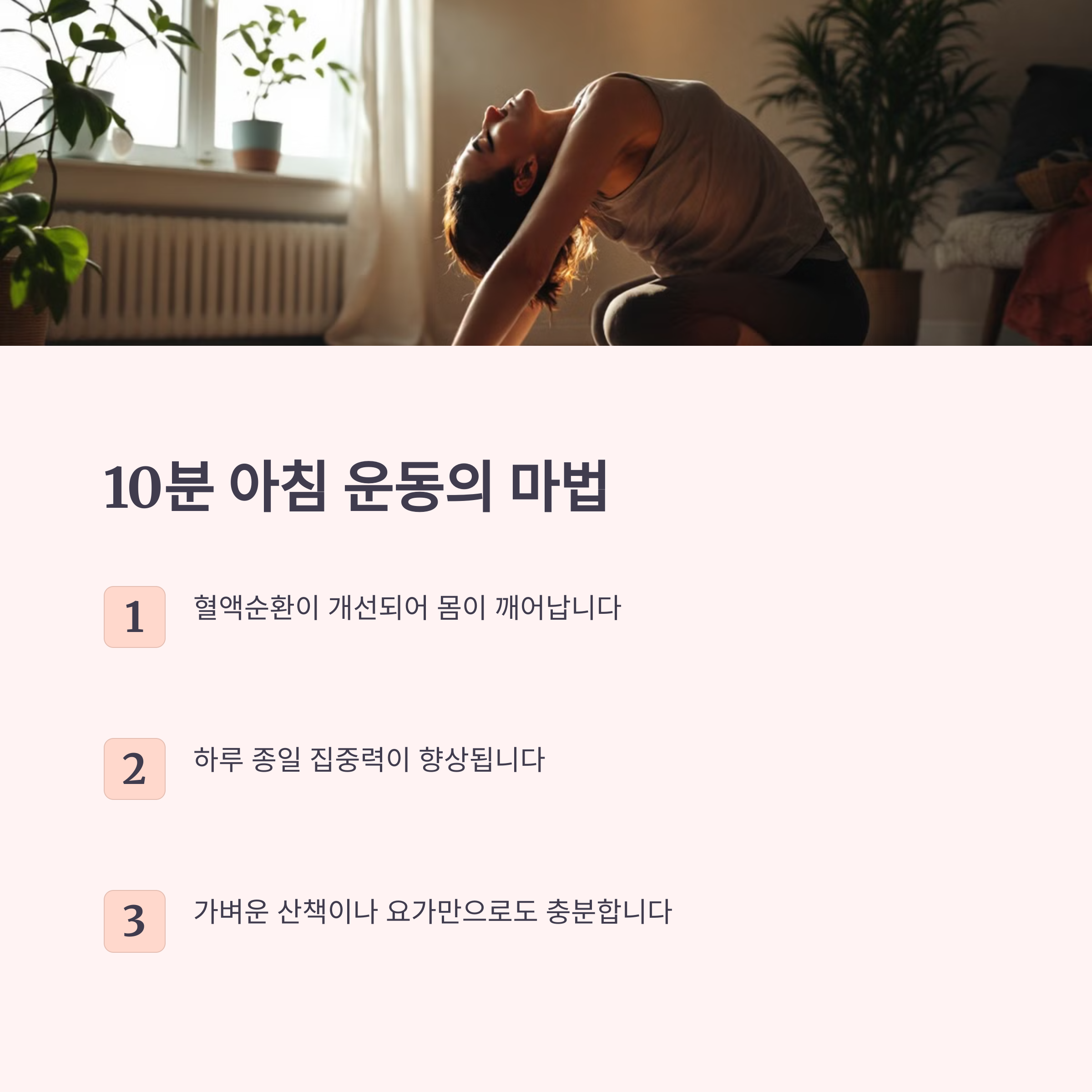 아침에 가벼운 운동을 하는 것도 **활기찬 하루를 만드는 핵심 요소**입니다. 10~15분 정도 스트레칭이나 요가, 혹은 가벼운 산책을 하면 **혈액순환이 원활해지고 뇌로 가는 산소 공급량**이 증가합니다. 연구에 따르면 아침 운동을 한 사람들은 그렇지 않은 사람들보다 **기분이 긍정적이고 스트레스 수치가 낮았다**고 합니다. 따라서, 바쁜 일정 속에서도 간단한 운동 루틴을 추가하면 아침부터 활력이 넘치는 하루를 시작할 수 있습니다.