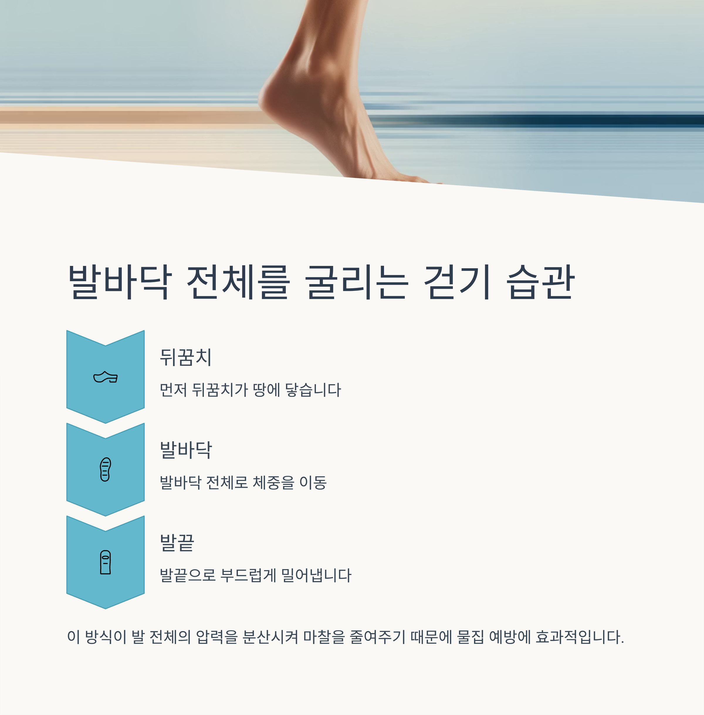 페달을 밟듯이 발끝에 무게를 싣고 걷는 습관은 뒤꿈치와 신발 사이에 반복적인 마찰을 유발합니다.