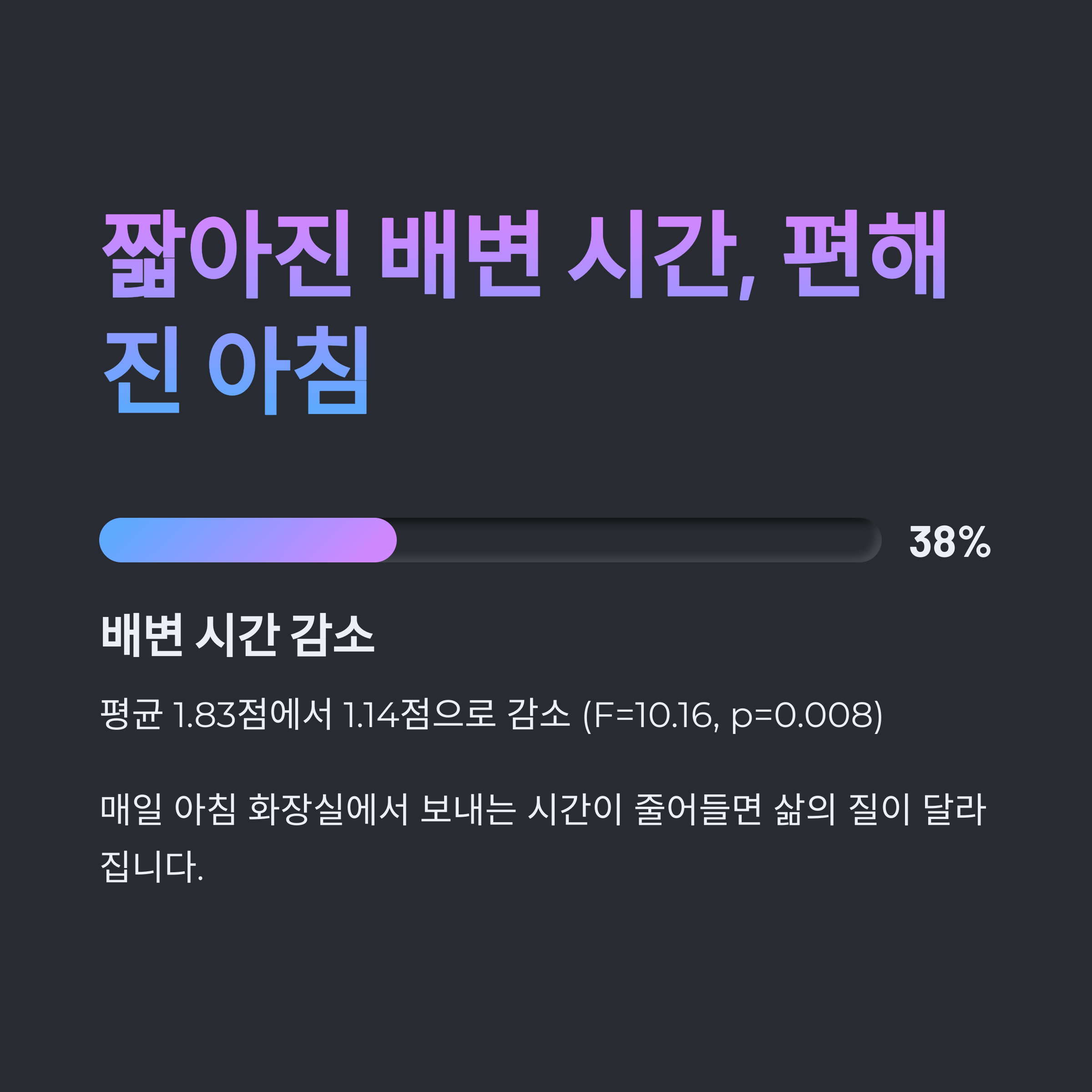2주 후에는 1.14점으로 감소했으며(F=10.16, p=0.008), 이는 약 38%의 감소 효과입니다. 매일 아침 화장실에서 보내는
