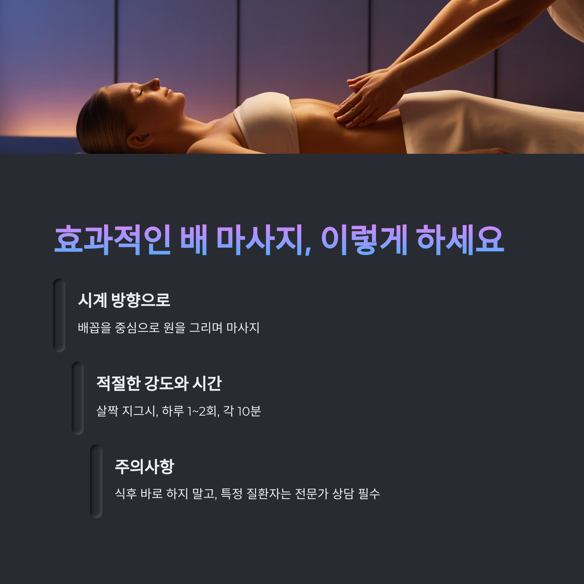 복부 마사지 효과를 극대화하기 위해 아래 4가지를 함께 실천해 보세요.