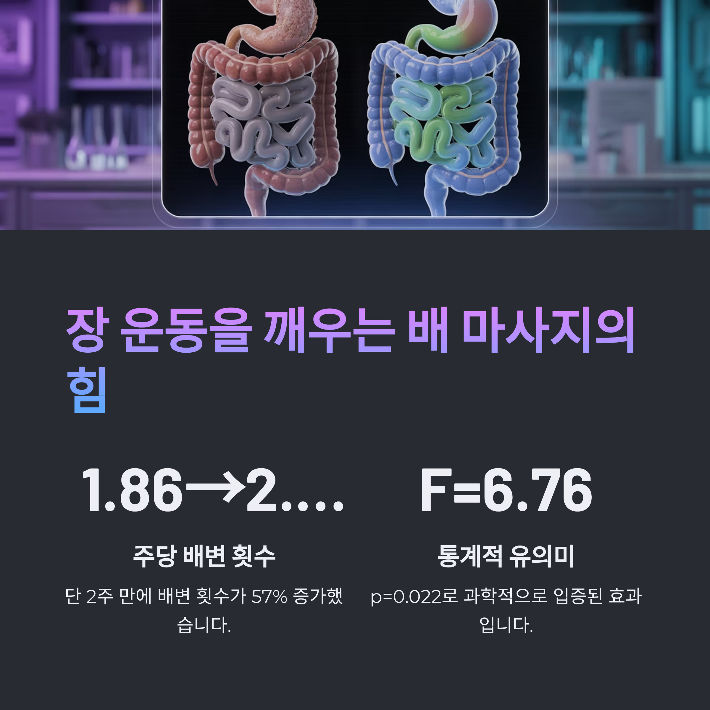 수치였습니다(F=6.76, p=0.022). 배 마사지가 단순한 기분 전환을 넘어, 장 기능에 직접 작용함을 입증하는 대표적 사례입니다.