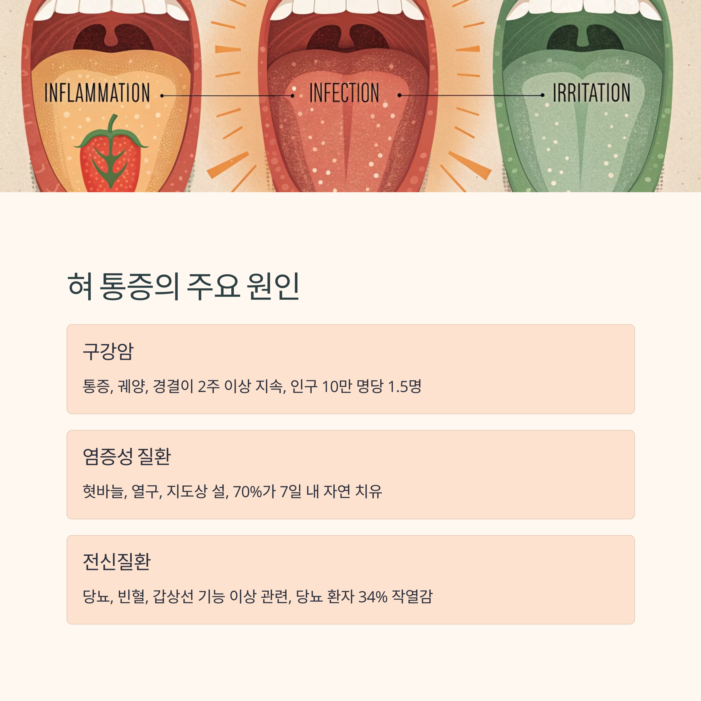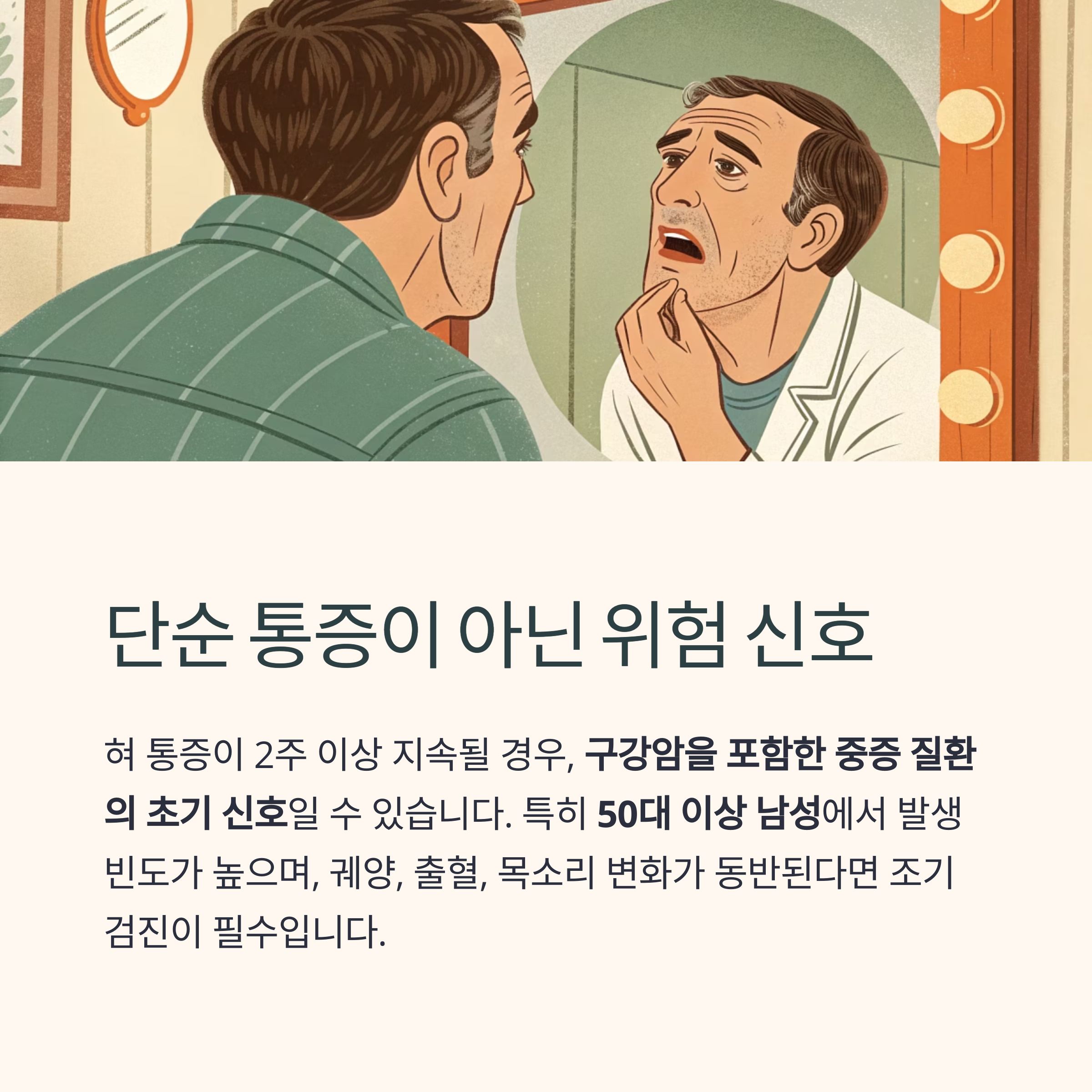 혀에 생긴 통증이 2주 이상 계속될 경우, 단순한 염증이 아니라 구강암을 포함한 중증 질환의 초기 신호일 수 있습니다.