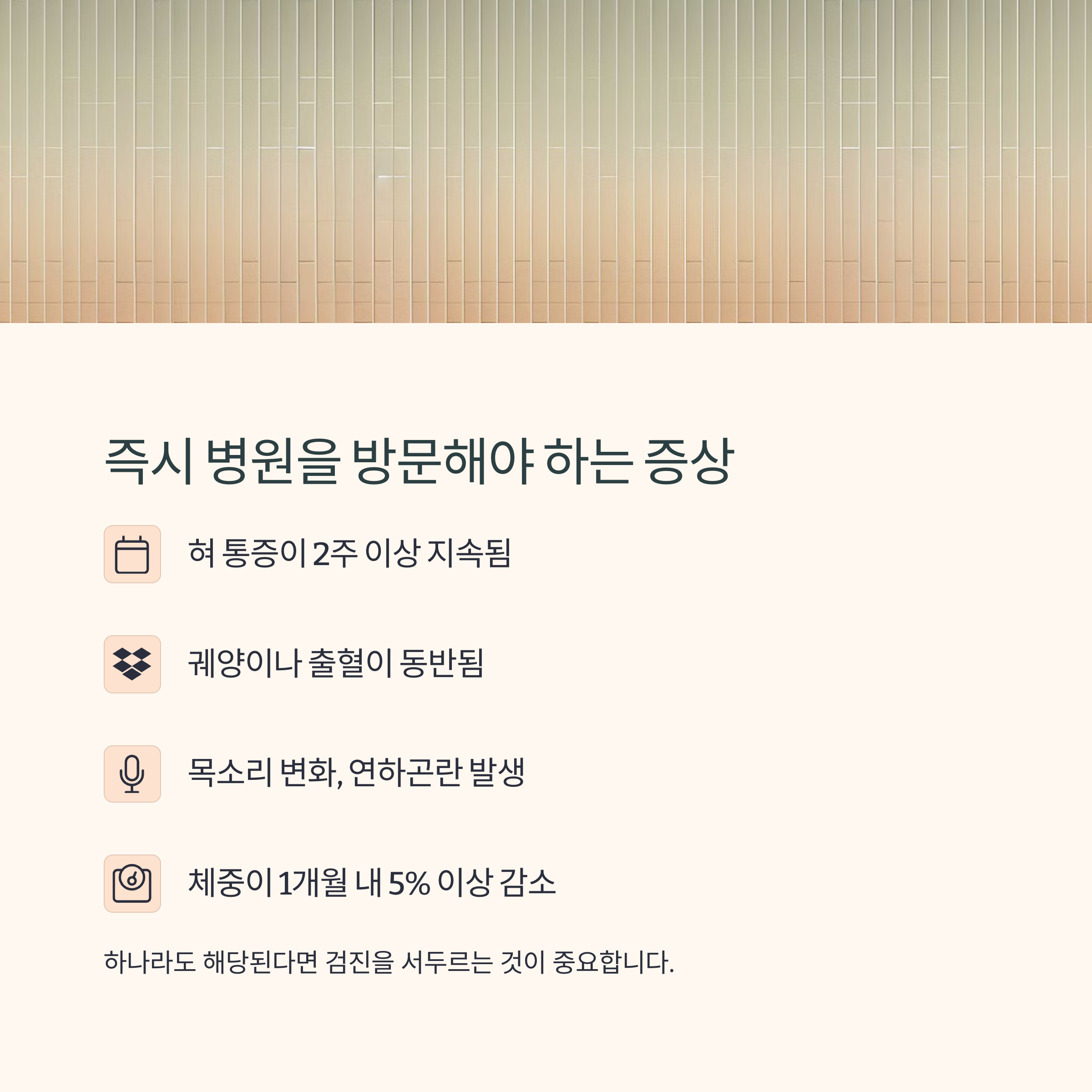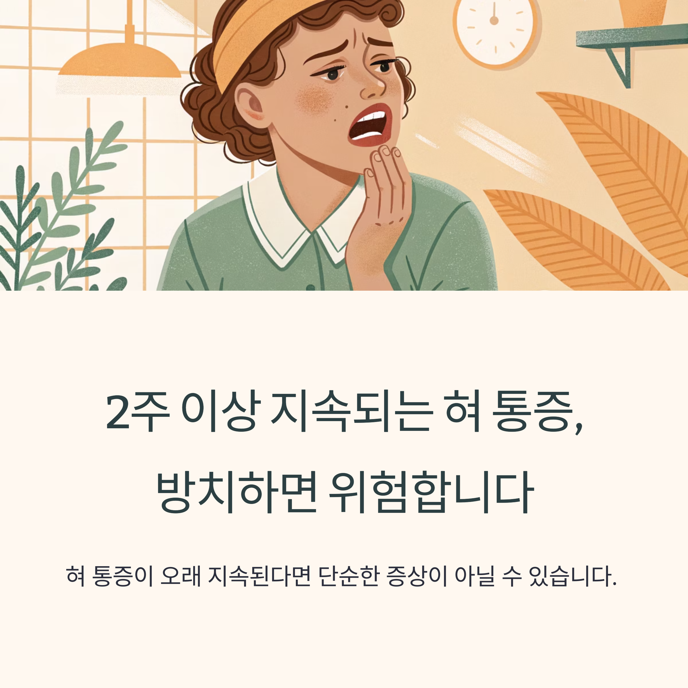 혀에 생긴 통증이 2주 이상 계속될 경우, 단순한 염증이 아니라 구강암을 포함한 중증 질환의 초기 신호일 수 있습니다.