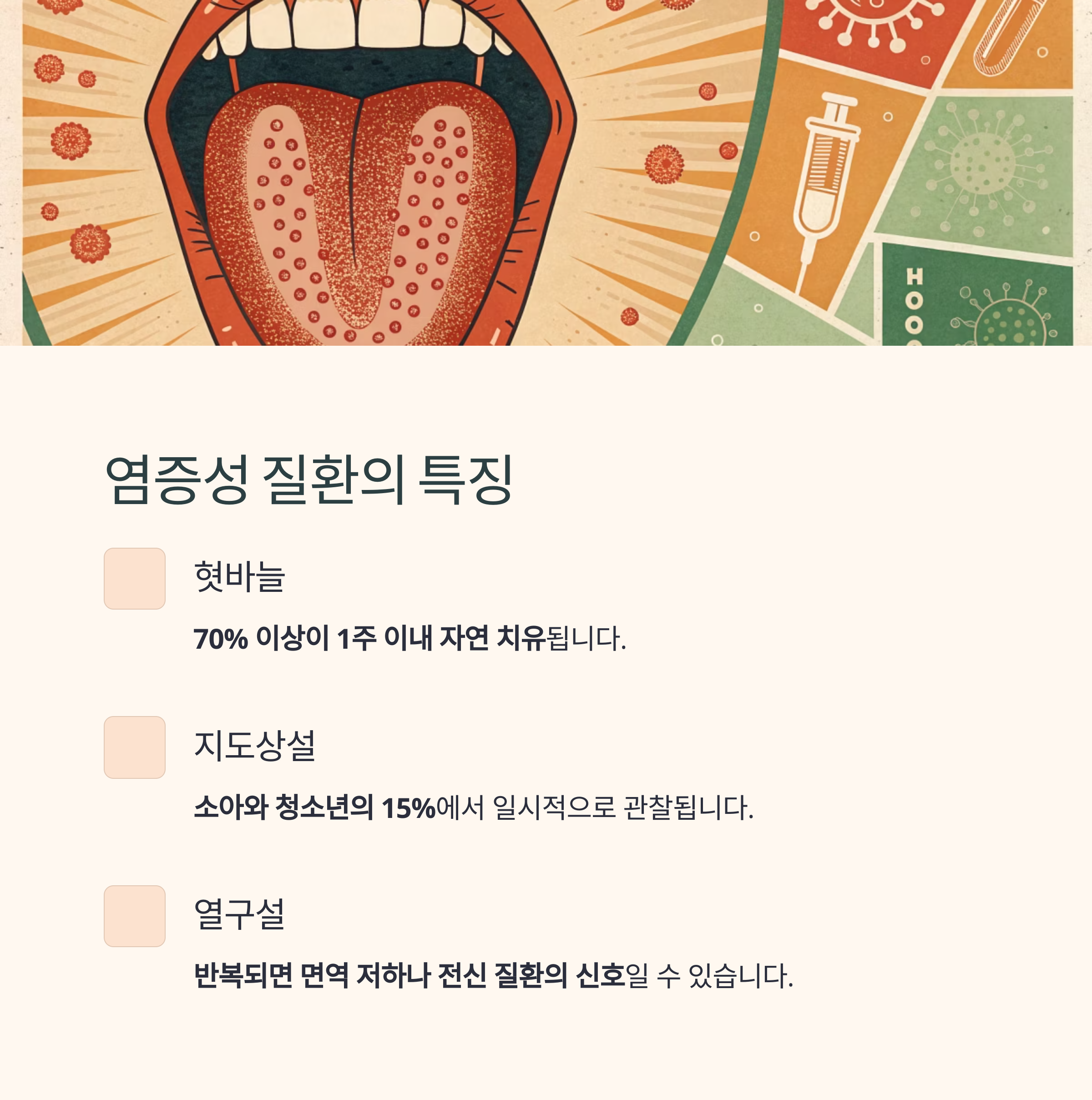 | 염증성 질환 | 혓바늘, 열구, 지도상 설 | 대부분 자연 치유 | 혓바늘 70% 7일 내 소실 |