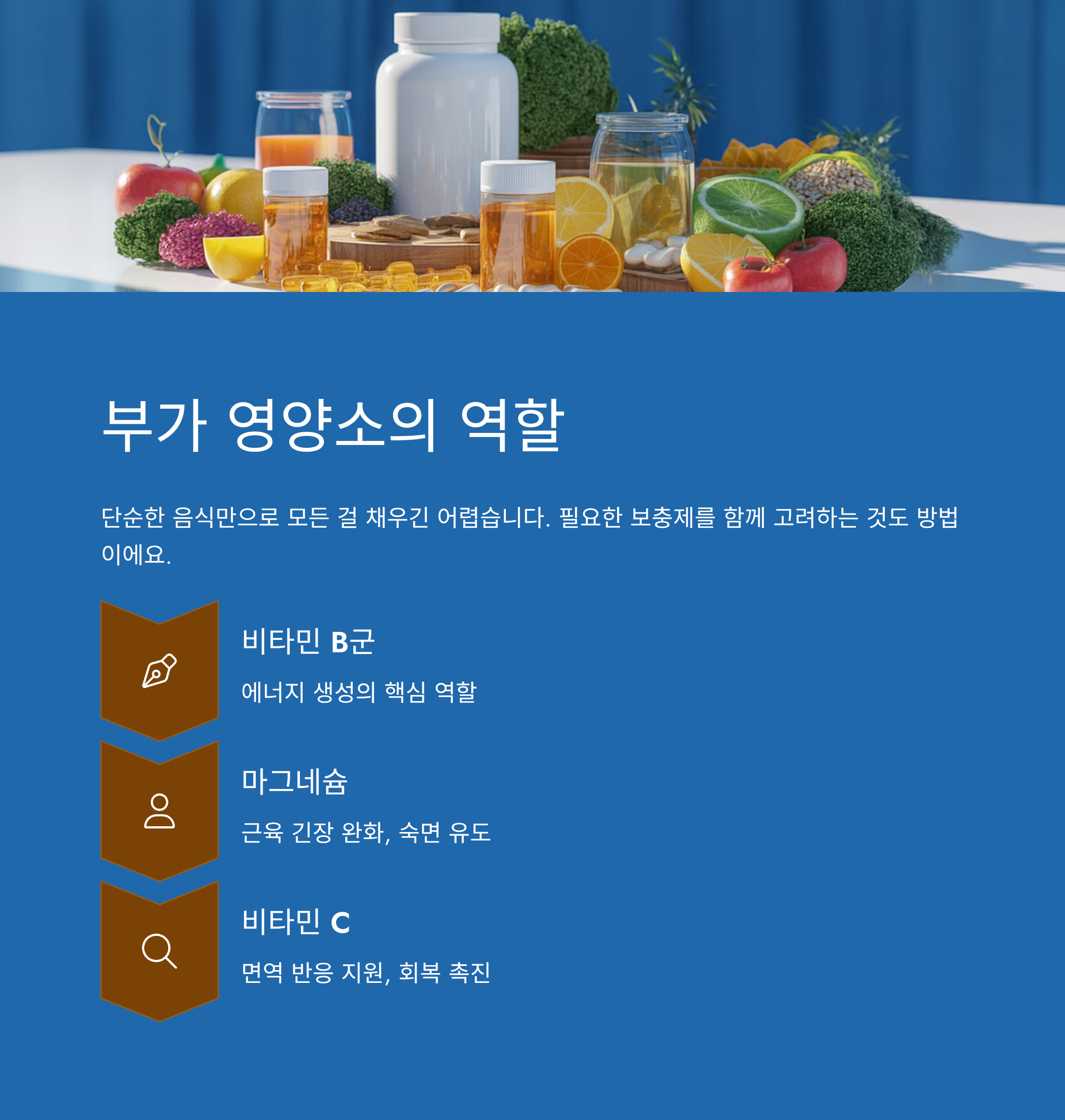 단순한 음식만으로 모든 걸 채우긴 어렵습니다. 따라서 필요한 보충제를 함께 고려하는 것도 방법이에요.