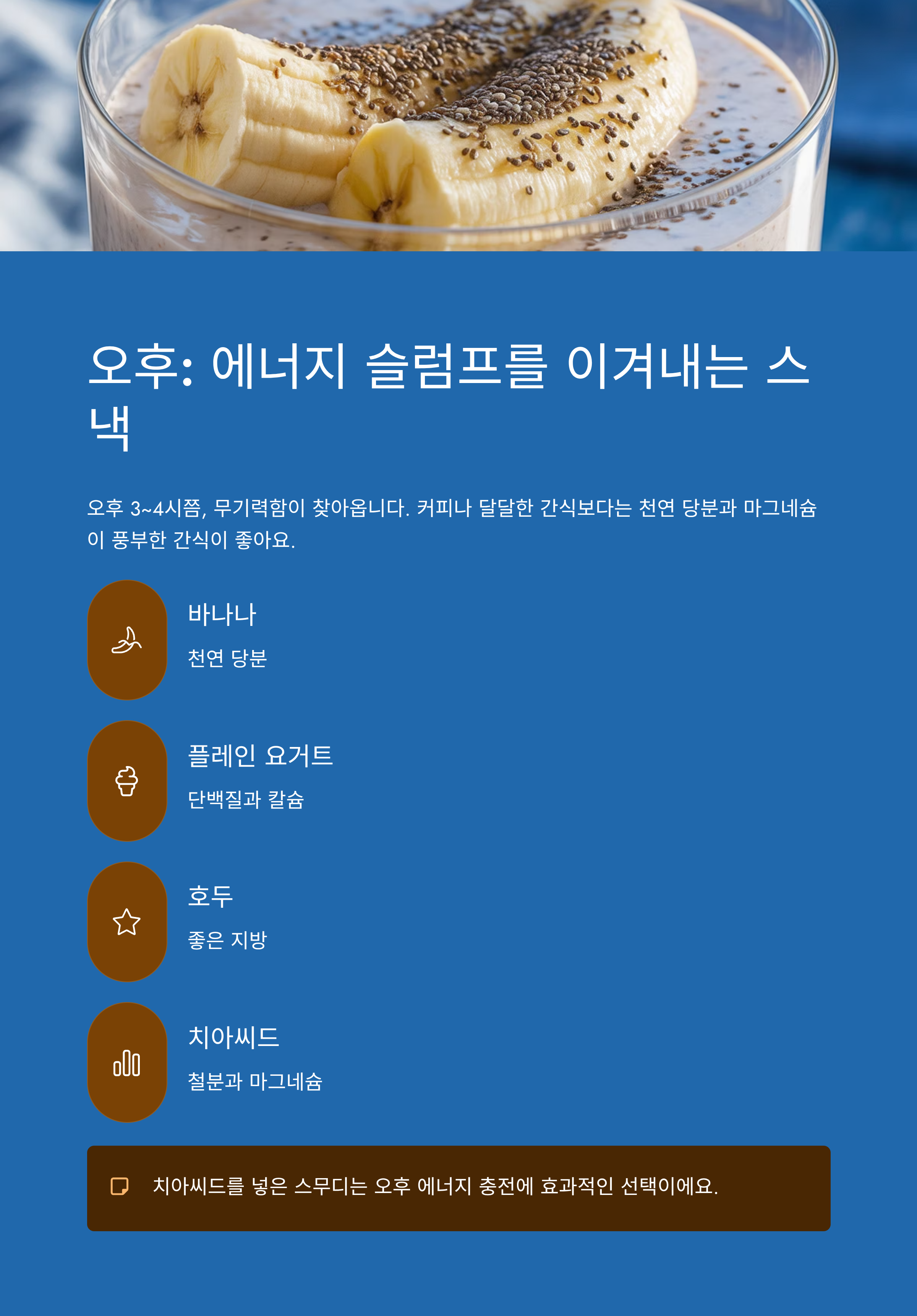 | 오후 | 바나나 + 요거트 + 치아씨드 스무디 | 마그네슘, 천연당, 철분 |