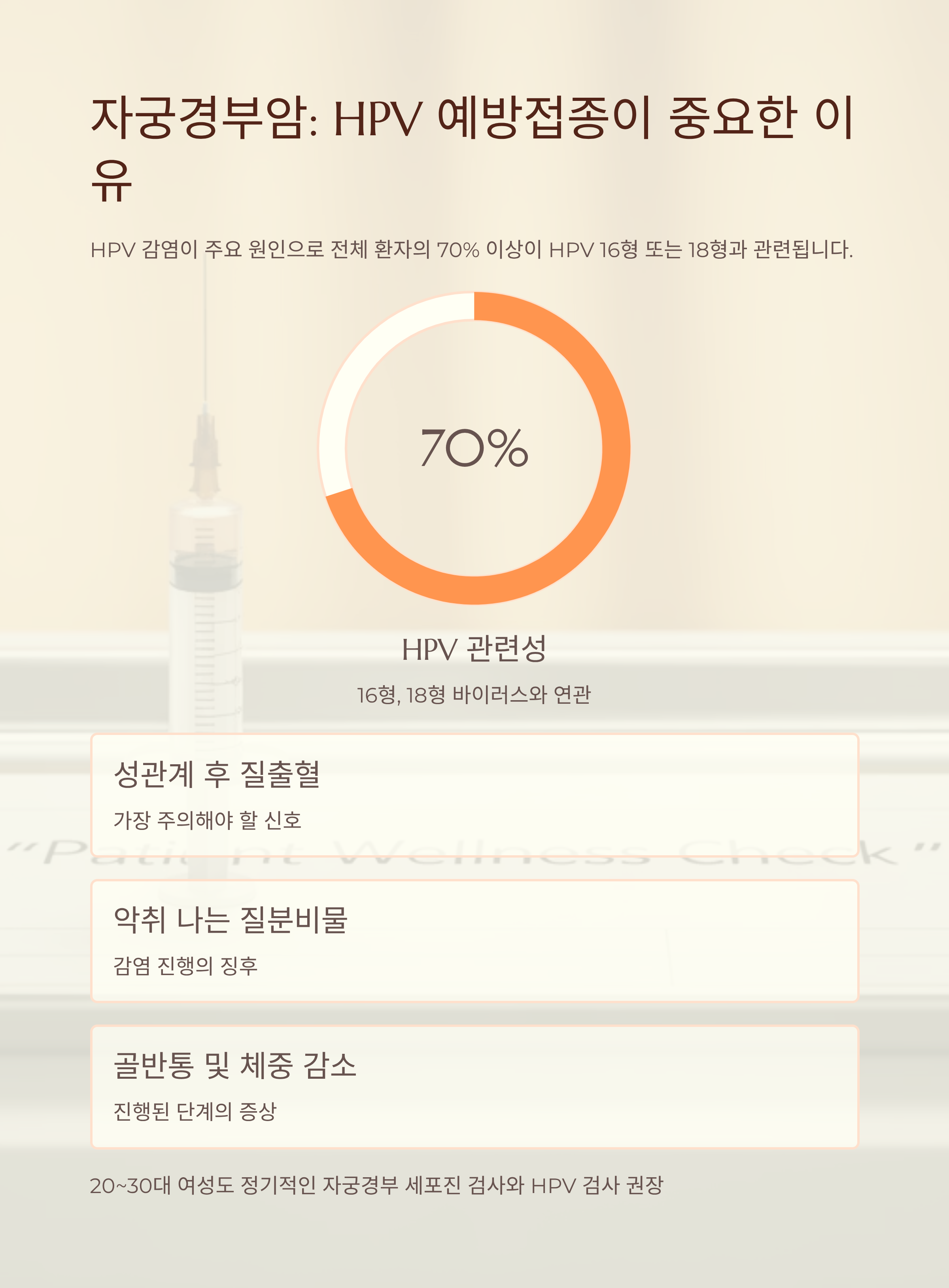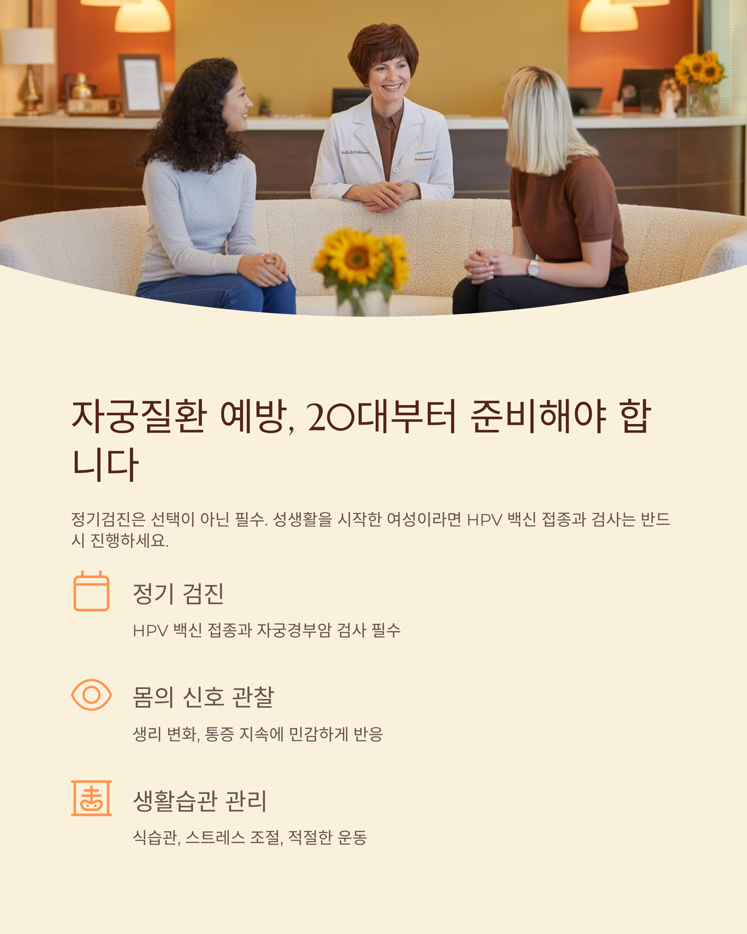 정기검진은 선택이 아닌 필수이며, 특히 성생활을 시작한 여성이라면 HPV 백신 접종과 자궁경부암 검사는 반드시 진행해야 합니다.