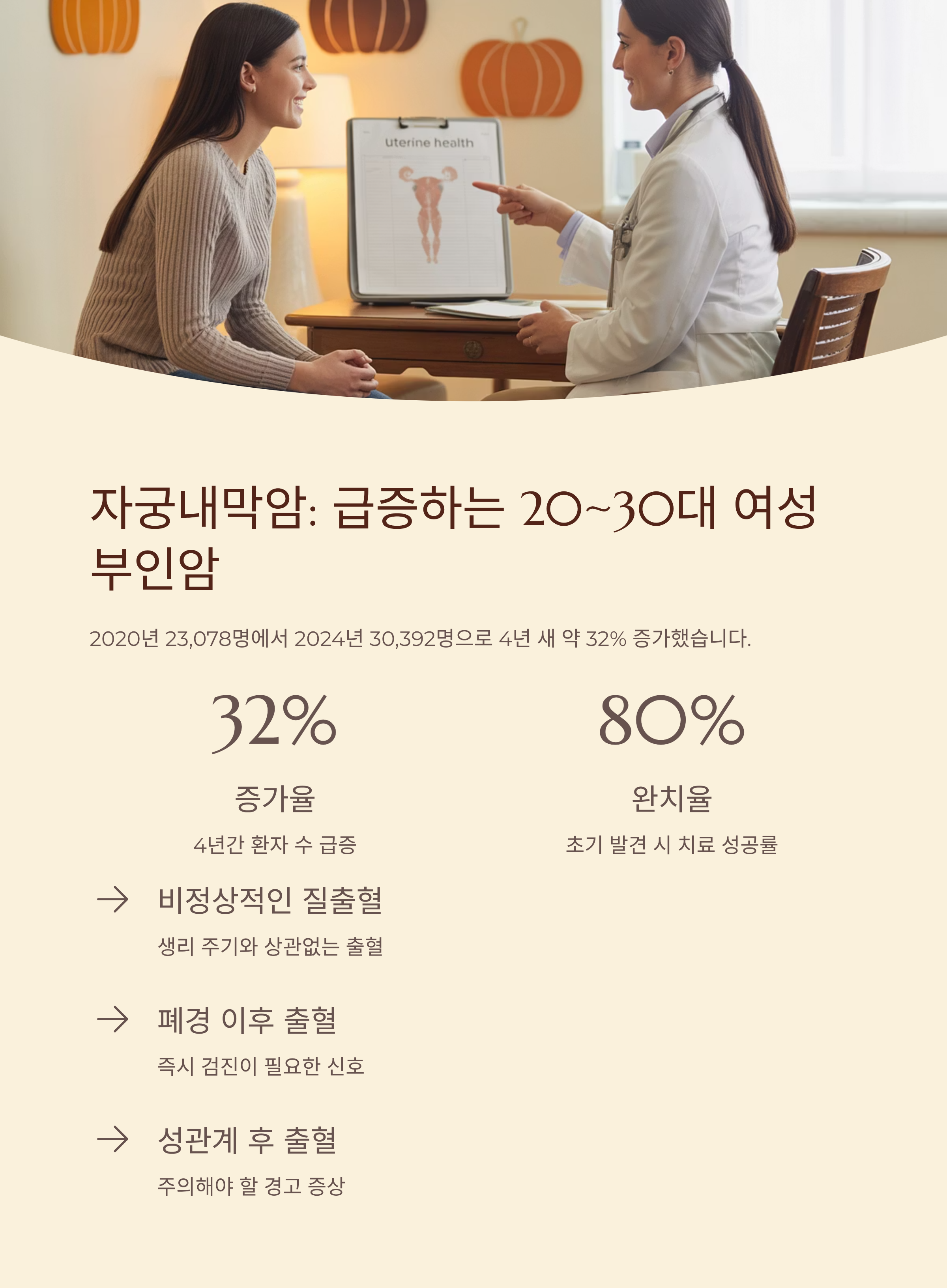 | 자궁내막암 | 비정상 출혈, 성관계 후 출혈 | 환자 수 4년간 32% 증가, 젊은층 급증 |