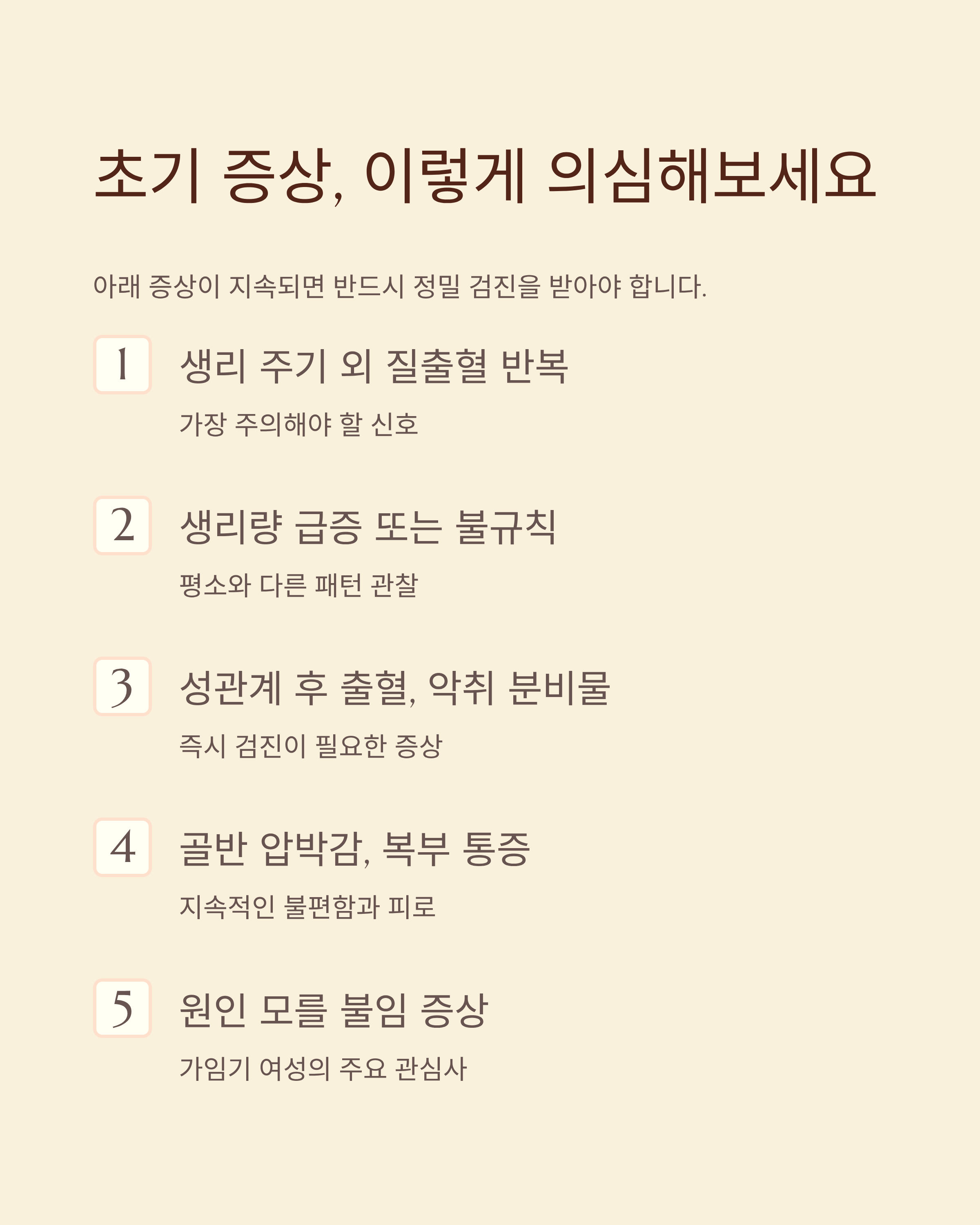 초기에 감지하기 어려운 자궁질환이지만, 아래와 같은 증상이 지속되면 반드시 정밀 검진을 받아야 합니다.