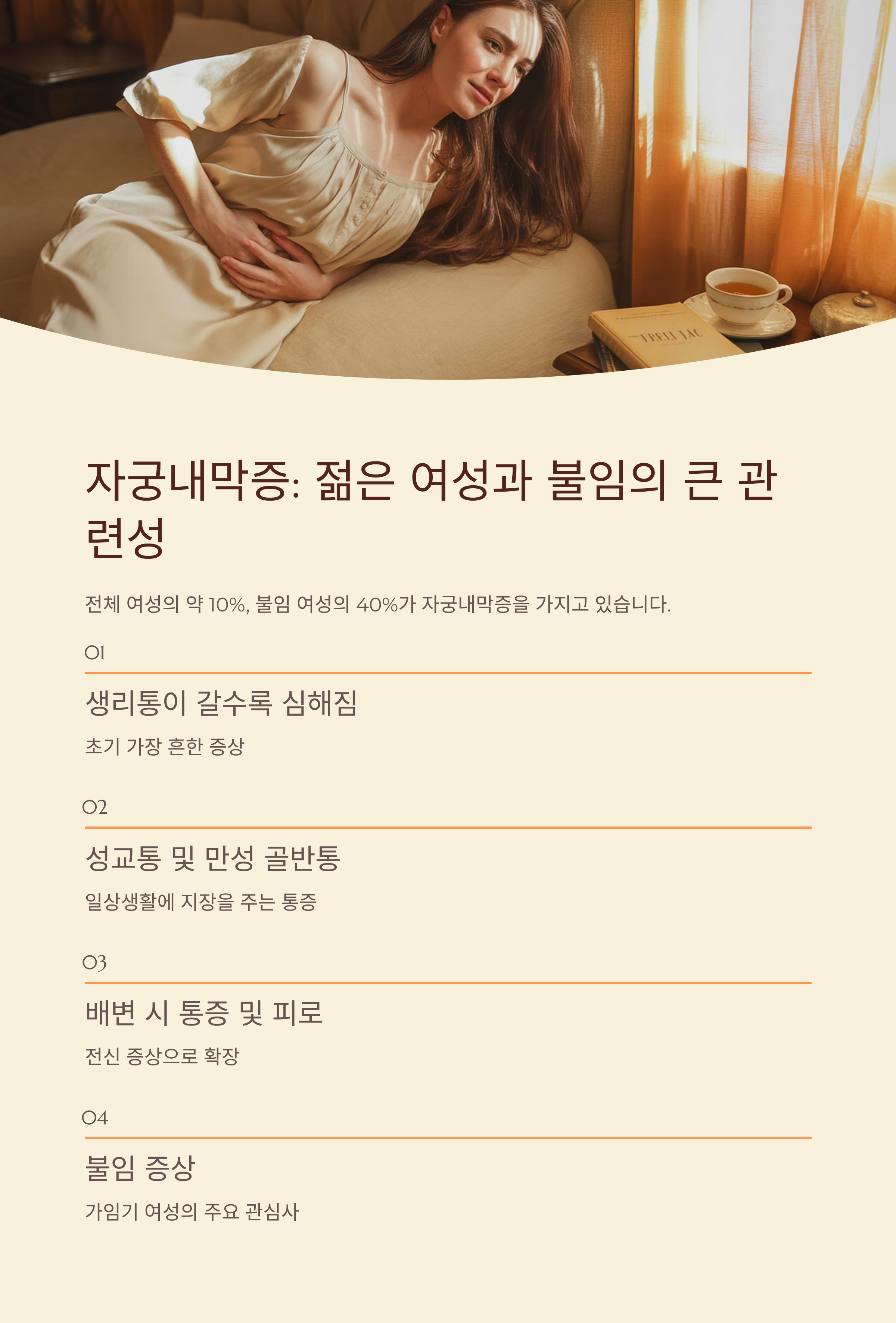 초기 증상은 생리통이 갈수록 심해지는 것에서 시작하여, 성교통, 만성 골반통, 배변 시 통증, 피로, 불임 등으로 확장됩니다.