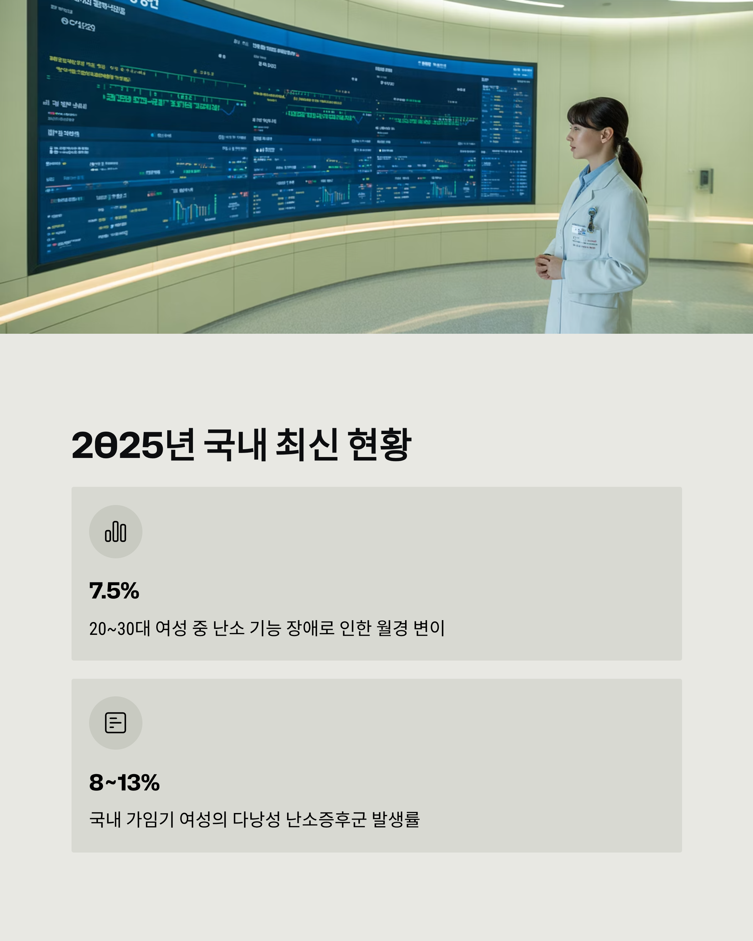 서울 및 지역 연구에 따르면 20대~30대 여성 중 약 7.5%에서 난소 기능 장애로 인한 월경 변이가 보고되었습니다. 또한 다낭성 난소증후군은 국내 가임기 여성의 8%~13%에서 발생하는 것으로 나타났습니다.