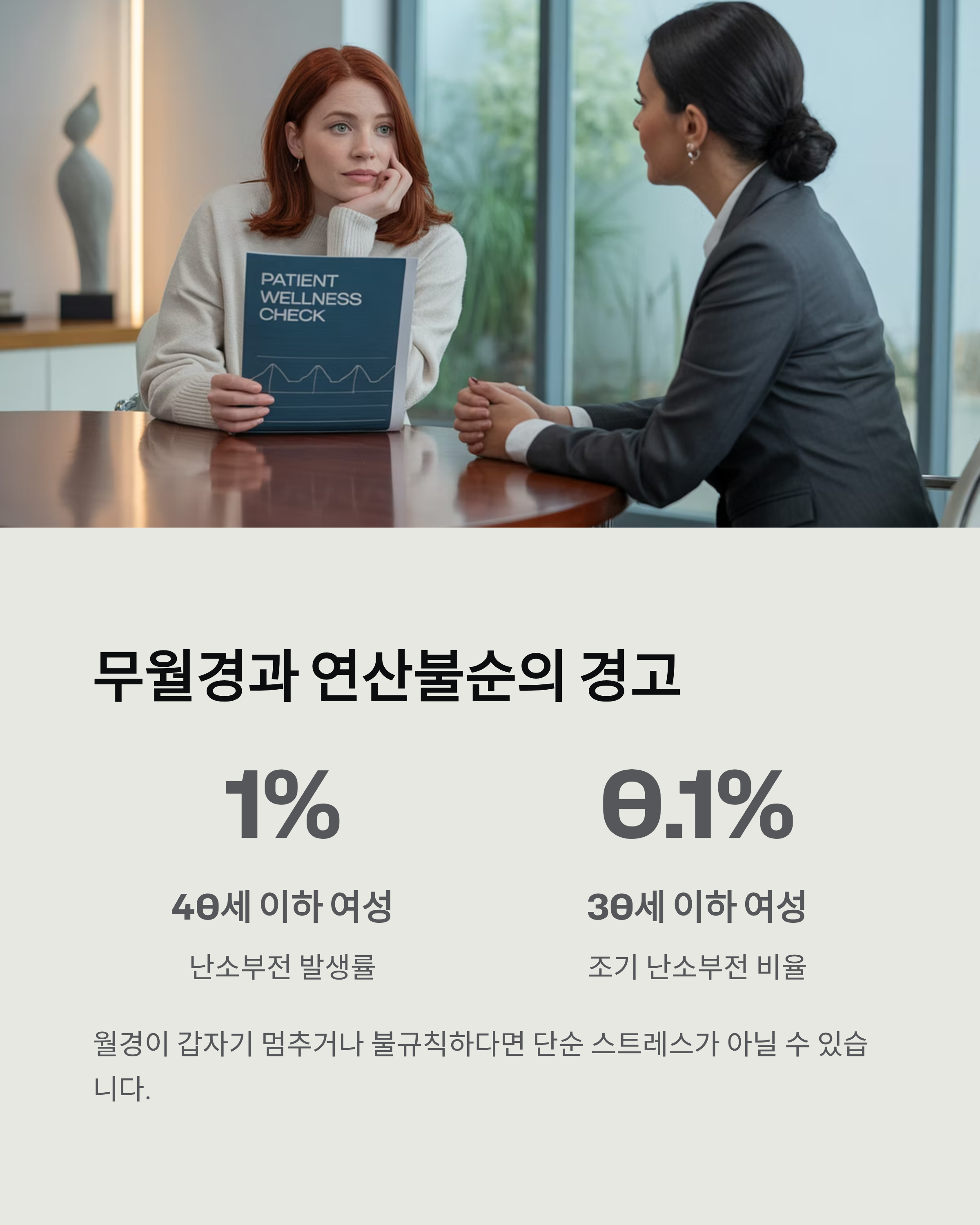 월경이 갑자기 멈추거나 너무 불규칙하다면 단순한 스트레스 문제가 아닐 수 있습니다. 난소부전이나 다낭성 난소증후군의 초기 신호일 수 있으며, 실제로 40세 이하 여성 100명 중 1명, 30세 이하 여성 1,000명 중 1명에서 난소부전이 보고되고 있습니다.