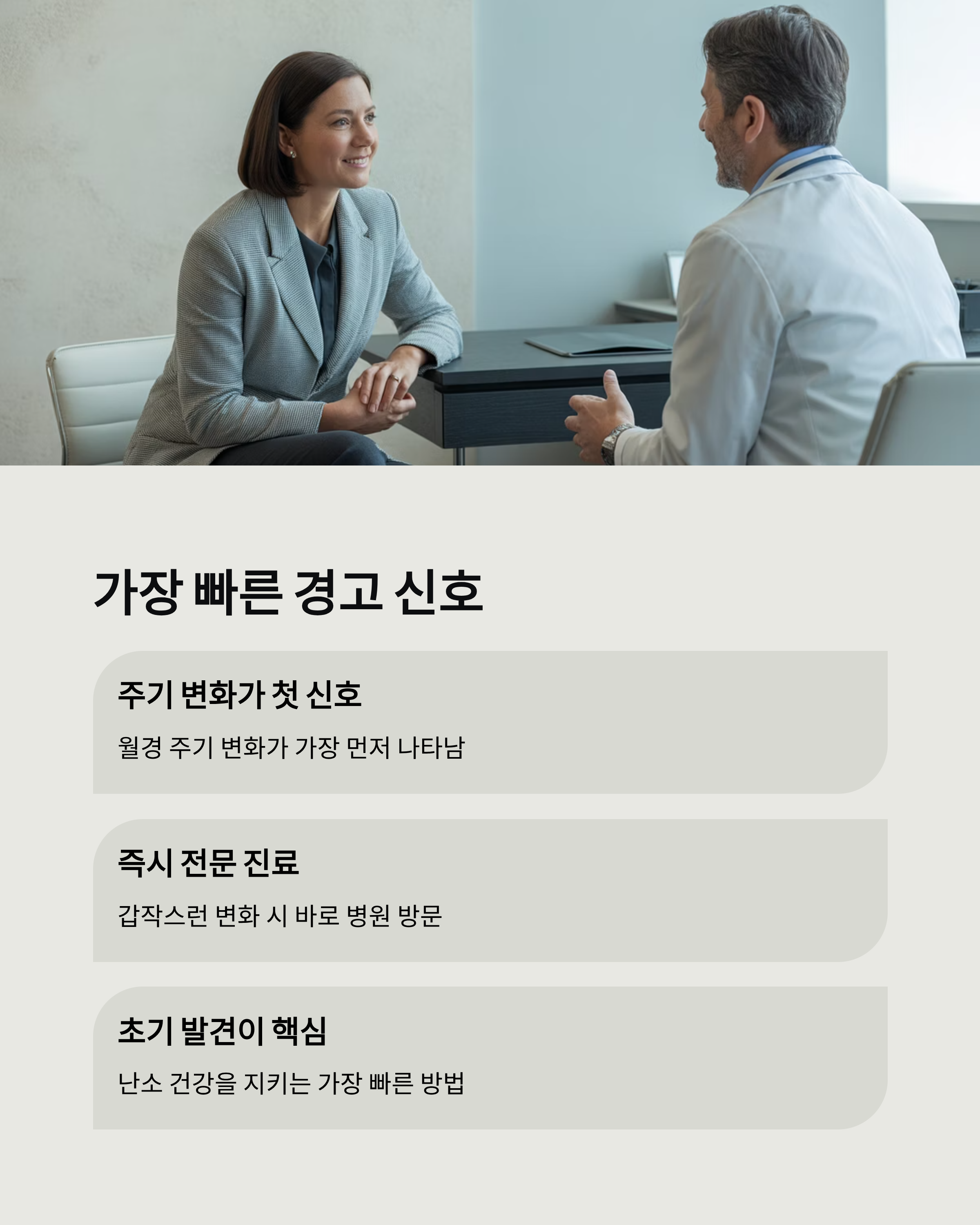 난소 이상은 대체로 월경 주기 변화가 가장 먼저 나타납니다. 생리가 갑자기 없어지거나 주기가 크게 흔들린다면 바로 전문 진료를 받아야 합니다. 초기 발견이 난소 건강을 지키는 가장 빠른 방법입니다.