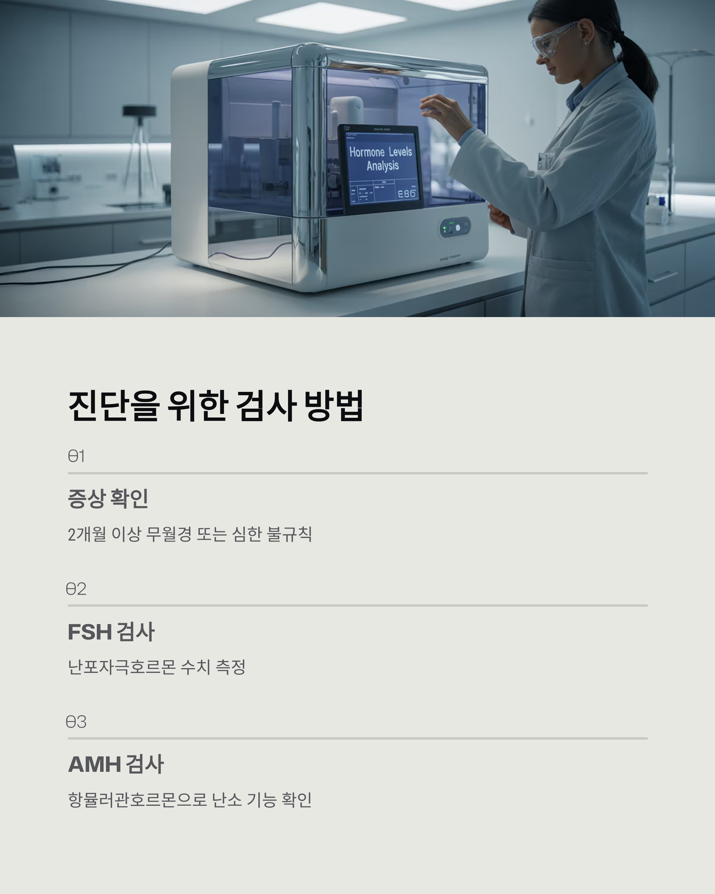월경이 2개월 이상 멈추거나 불규칙이 심할 경우, 난포자극호르몬(FSH)과 항뮬러관호르몬(AMH) 검사를 통해 난소 기능을 확인할 수 있습니다. 이 검사는 조기 진단에 핵심적인 역할을 하고 있습니다.