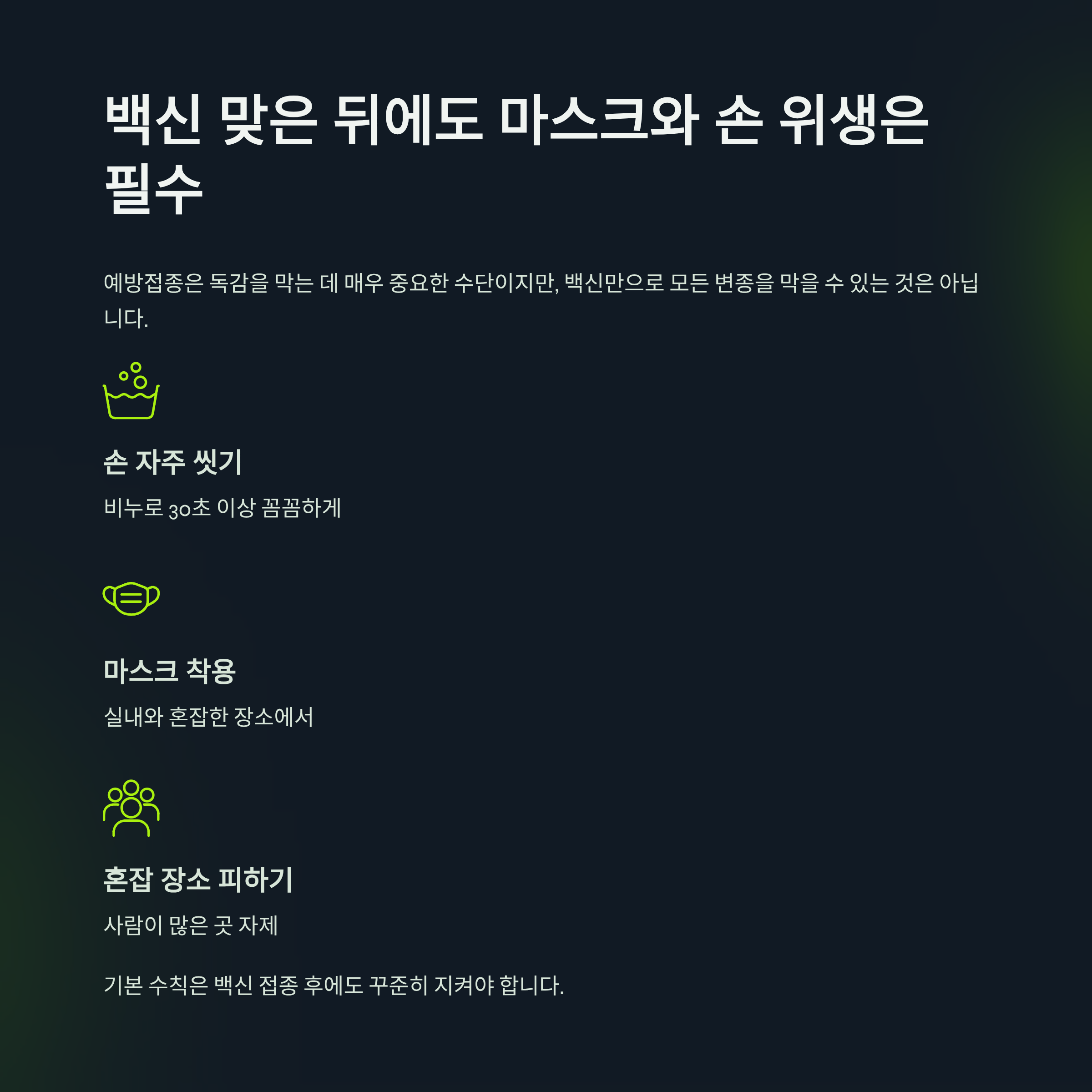 | 주의사항 | 접종 후에도 개인 위생 철저히 지키기 |