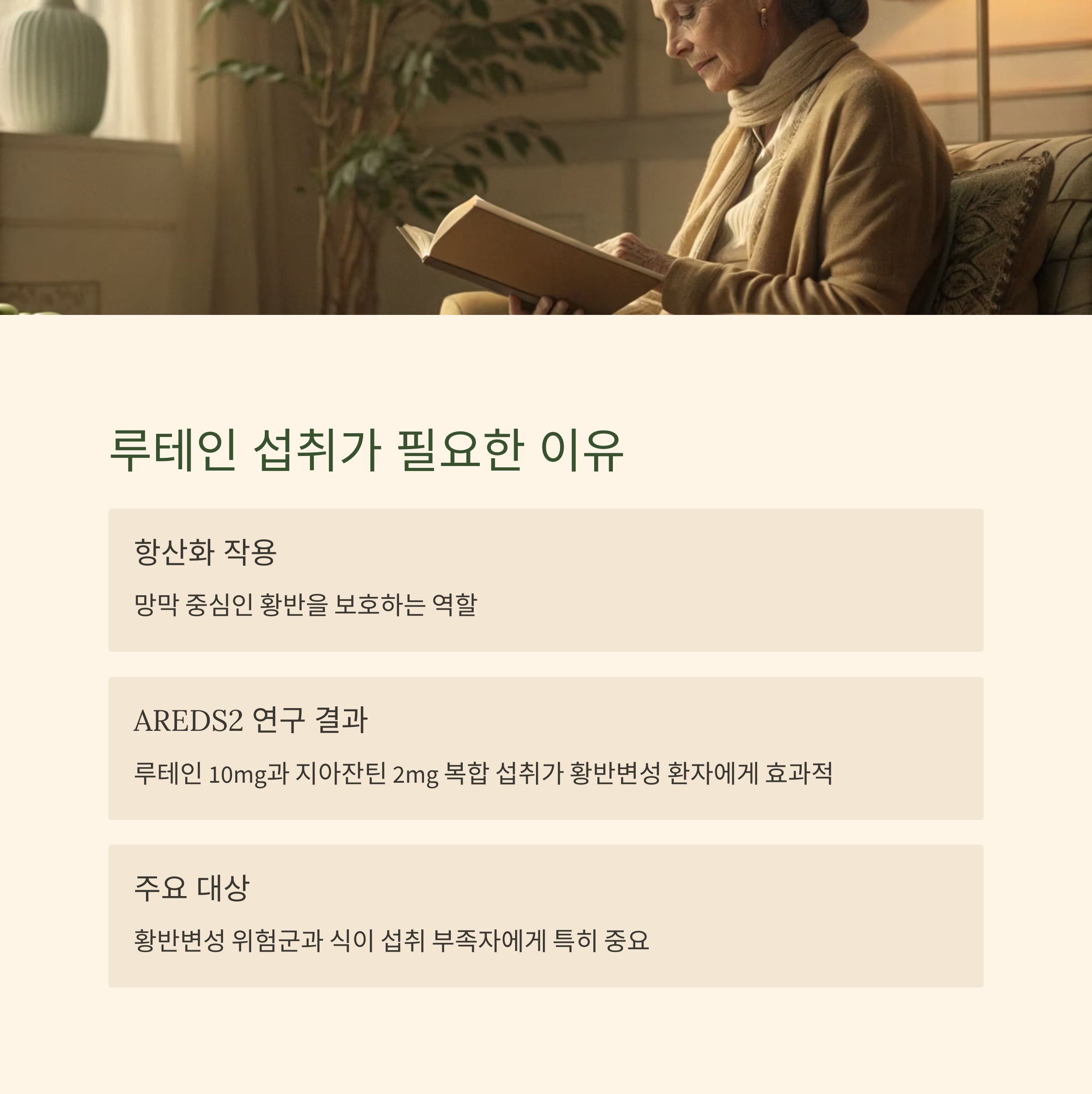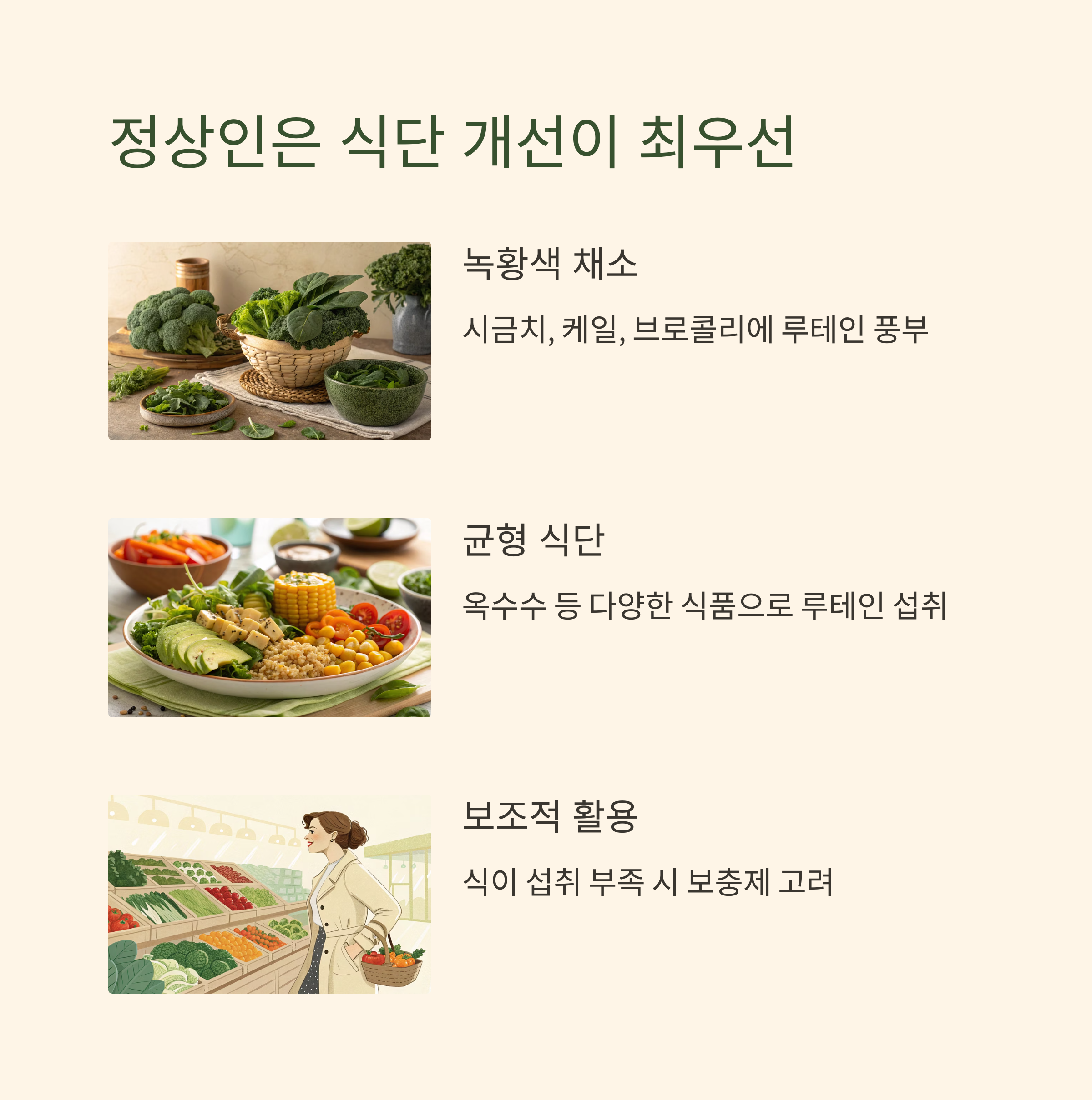 건강기능식품은 황반변성 위험군이나 식이 섭취가 부족한 경우에 보조적으로 활용하는 것이 가장 적절합니다.