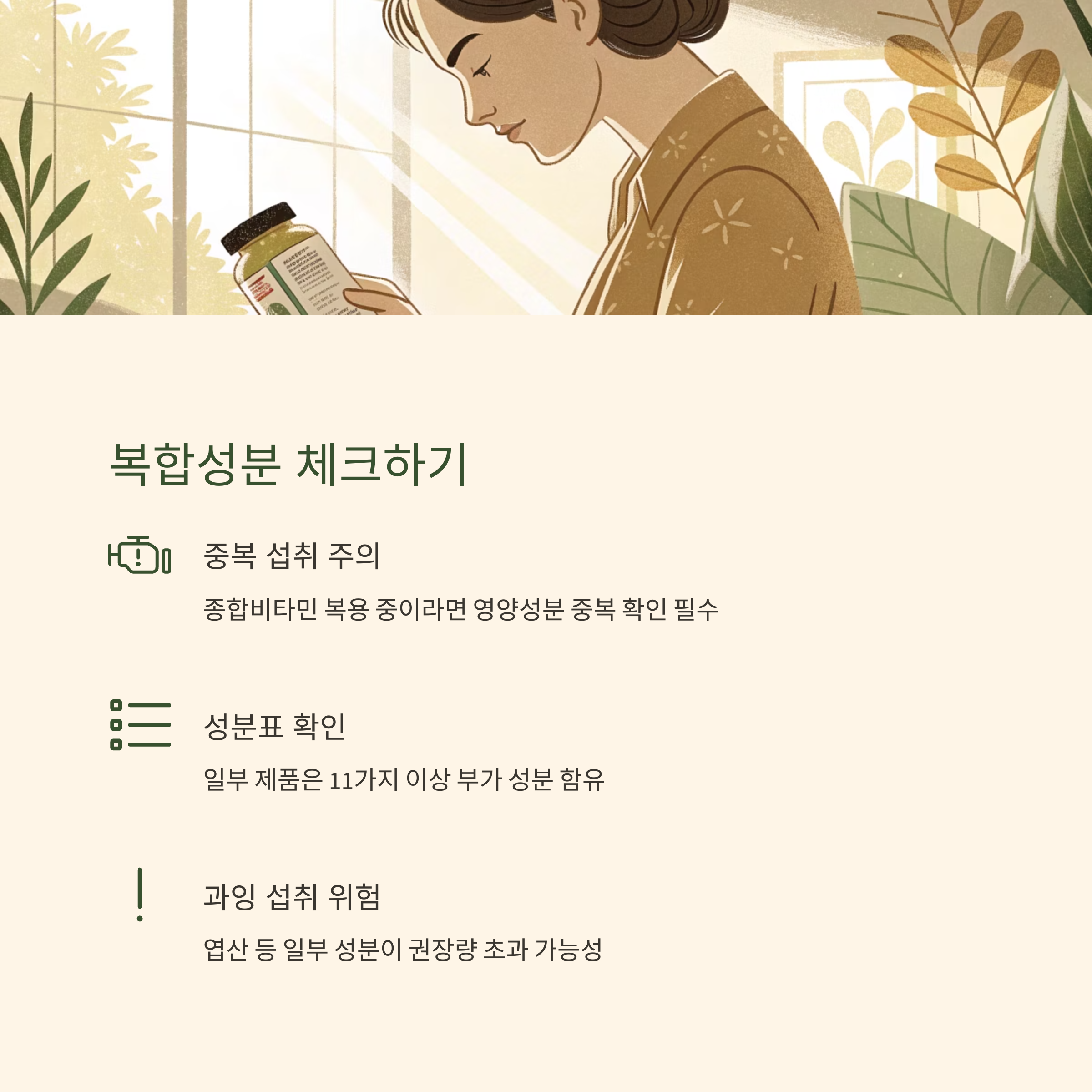 특히 종합비타민 복용 중인 경우 "영양성분 중복 섭취에 주의" 해야 합니다.