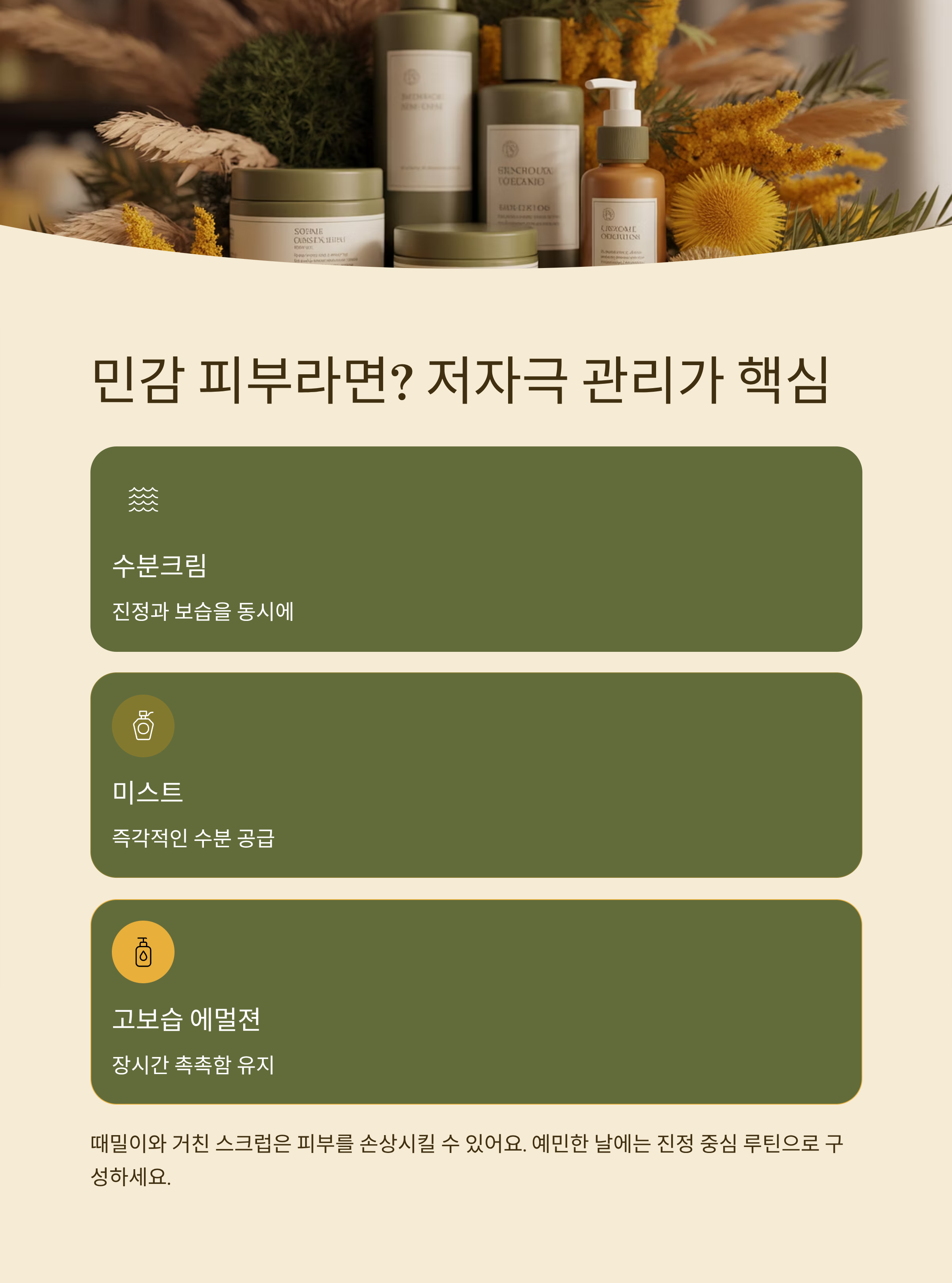 민감성 피부이거나 자극에 예민한 경우라면 강한 필링보다 저자극 보습과 진정 루틴이 더 적합합니다. 때밀이, 거친 스크럽은 오히려 피부를 손상시킬 수 있으므로 피하는 것이 좋아요.